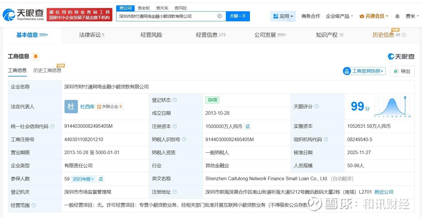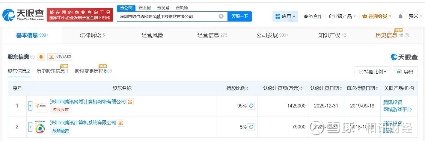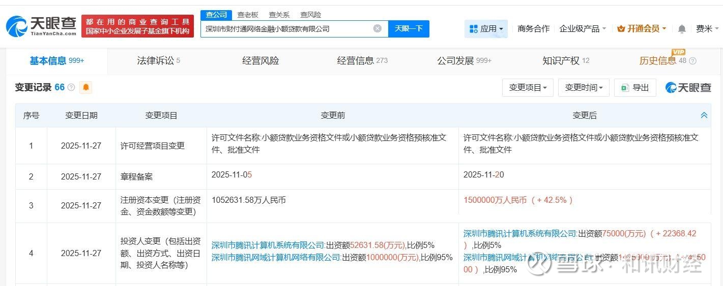 天眼查工商信息显示,近日,财付通小贷关联公司深圳市财付通网络金融小额贷款有限公司发生工商变更,注册资本由约105.3亿人民币增至150亿人民币,增幅42.5%。
