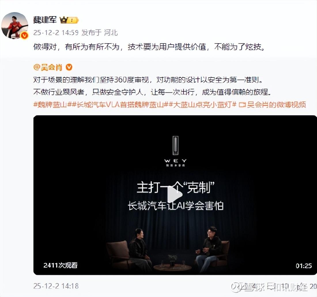 对此,长城汽车董事长魏建军转发微博表示认同:做得对,有所为有所不为,技术要为用户提供价值,不能为了炫技。