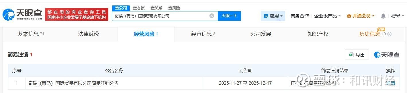 天眼查经营风险信息显示,近日,奇瑞(青岛)国际贸易有限公司新增一则简易注销公告,公告期为11月27日至12月17日。