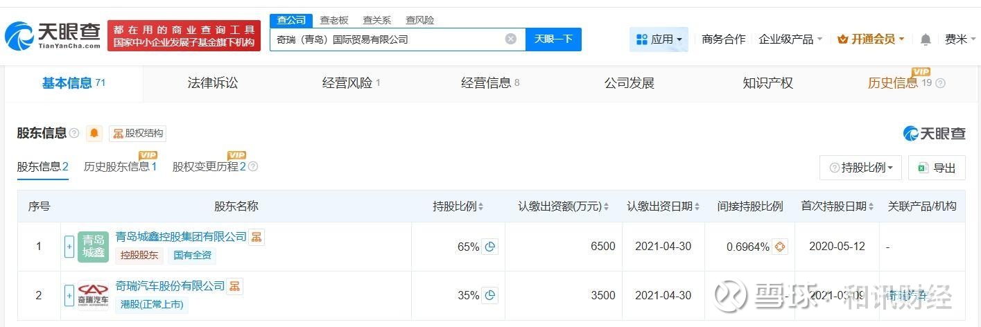 奇瑞(青岛)国际贸易有限公司成立于2020年5月,法定代表人为崔明寿,注册资本1亿人民币,经营范围包括汽车新车销售、汽车租赁、机动车改装服务等。股东信息显示,该公司由青岛城鑫控股集团有限公司、奇瑞汽车股份有限公司共同持股。