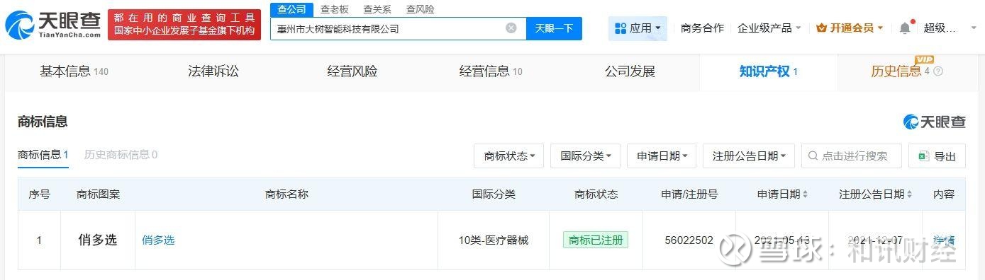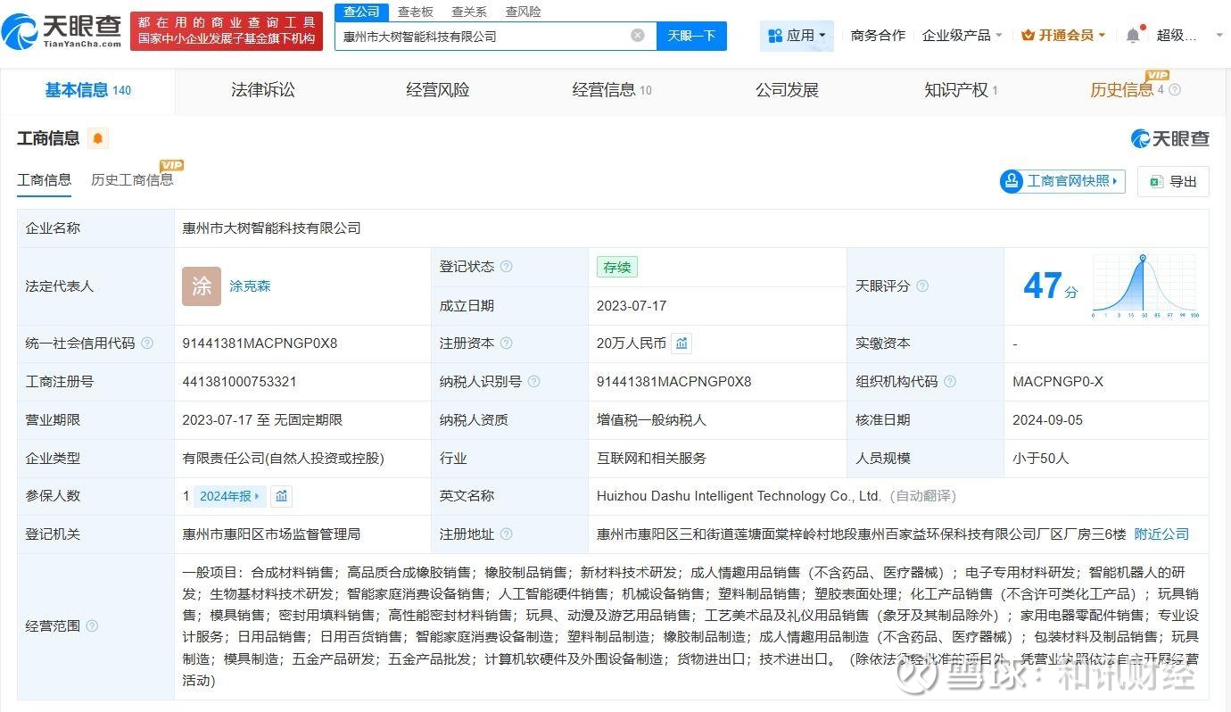 天眼查工商信息显示,惠州市大树智能科技有限公司成立于2023年7月,法定代表人为涂克森,注册资本20万人民币,经营范围包括高品质合成橡胶销售、橡胶制品销售、模具制造等,由涂克森、涂兴佳共同持股。知识产权信息显示,该公司曾注册“俏多选”商标。