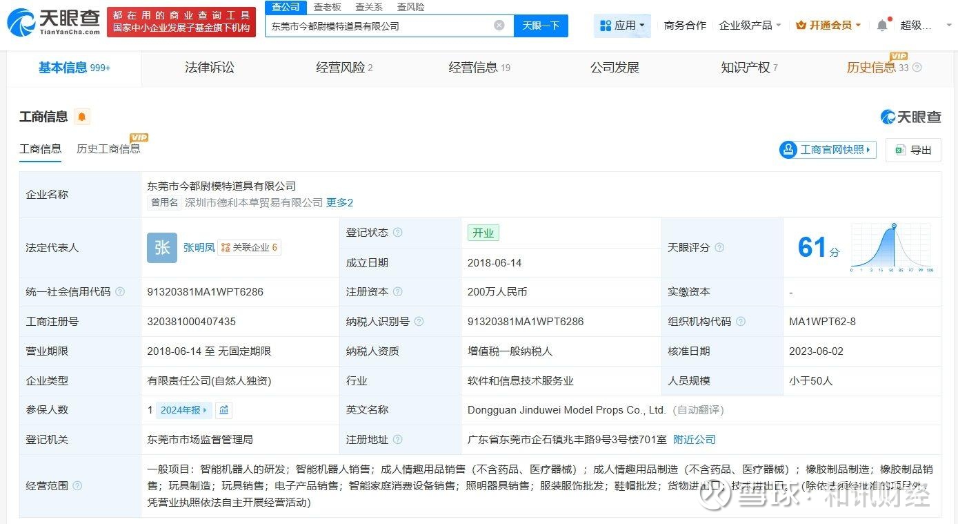 此外,东莞市今都尉模特道具有限公司成立于2018年6月,法定代表人为张明凤,注册资本200万人民币,经营范围包括智能机器人的研发、橡胶制品制造、橡胶制品销售等,由张明凤全资持股。变更记录显示,该公司曾多次变更名称。