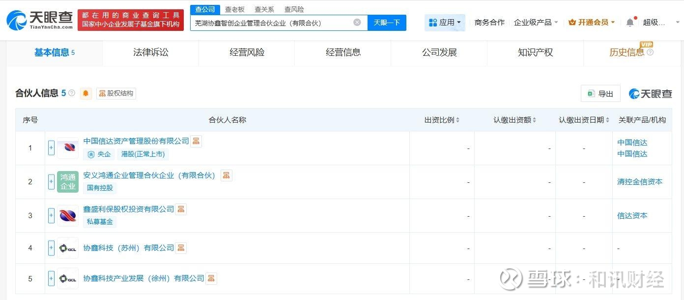 天眼查App显示,近日,芜湖协鑫智创企业管理合伙企业(有限合伙)成立,执行事务合伙人为鑫盛利保股权投资有限公司,出资额20.64亿人民币,经营范围包括企业管理、企业管理咨询。合伙人信息显示,该合伙企业由中国信达(01359.HK)、安义鸿通企业管理合伙企业(有限合伙)、协鑫科技(苏州)有限公司等共同出资。
