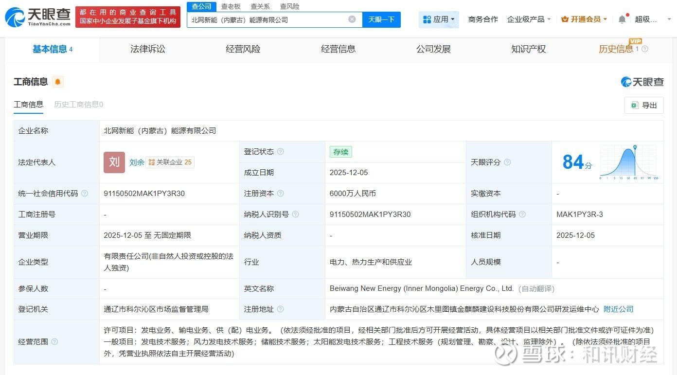 天眼查App显示,近日,北网新能(内蒙古)能源有限公司成立,法定代表人为刘余,注册资本6000万人民币,经营范围包括电技术服务、风力发电技术服务、储能技术服务、太阳能发电技术服务等。股东信息显示,该公司由晨丰科技(603685)全资持股。