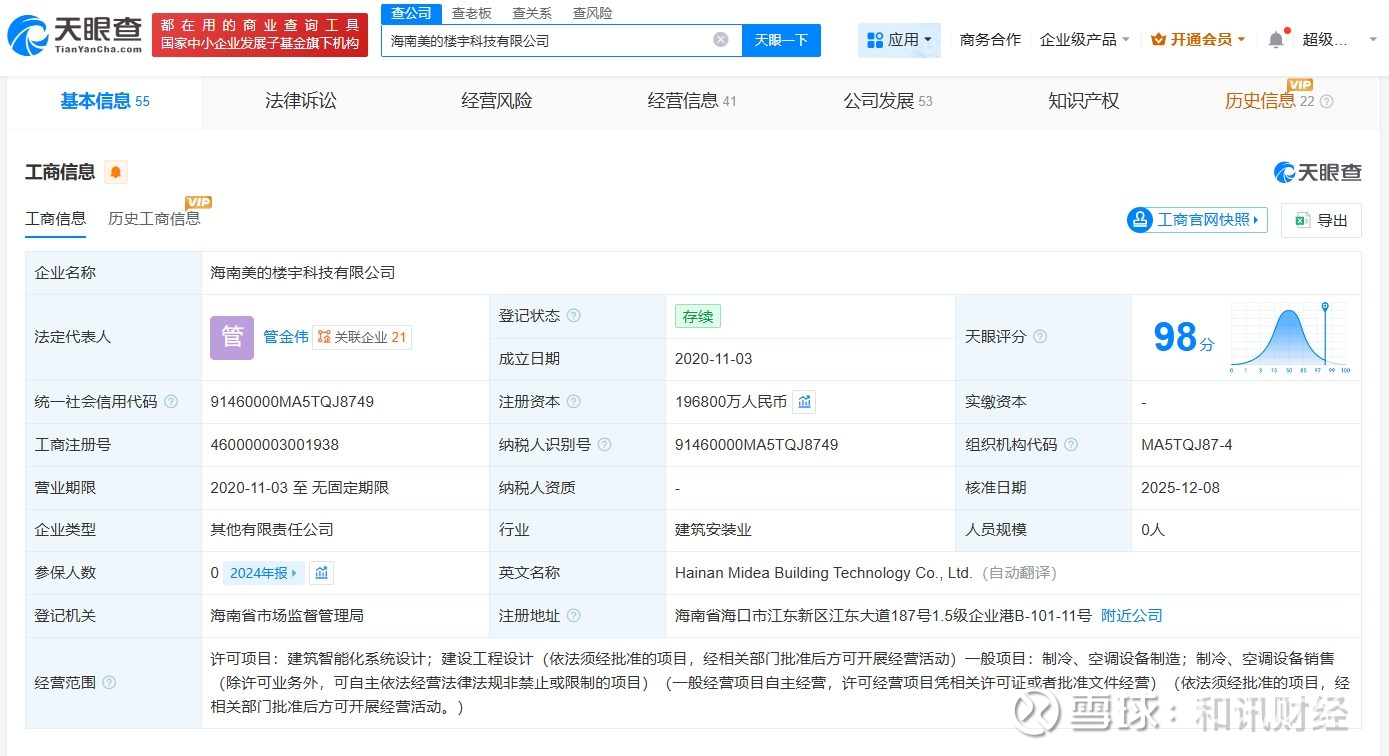 该公司成立于2020年11月,法定代表人为管金伟,经营范围含建筑智能化系统设计,建设工程设计,制冷、空调设备制造等。股东信息显示,该公司由美的集团(000333)及旗下佛山市美的空调工业投资有限公司共同持股。