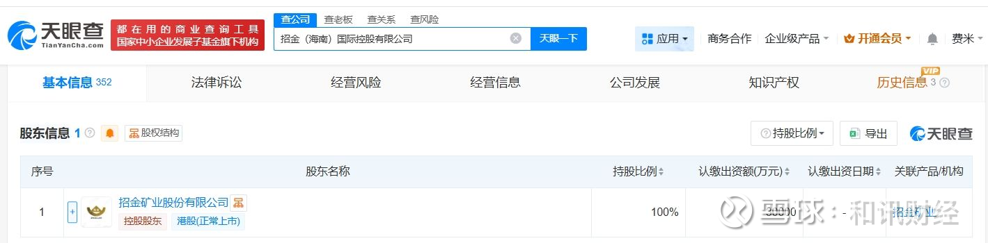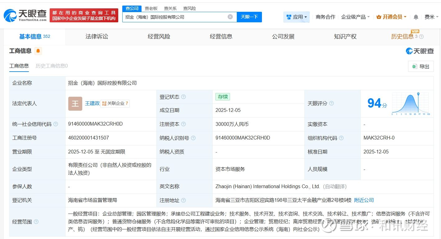 天眼查App显示,近日,招金(海南)国际控股有限公司成立,法定代表人为王建政,注册资本3亿人民币,经营范围包括企业总部管理、园区管理服务、承接总公司工程建设业务等,由招金矿业(01818.HK)全资持股。