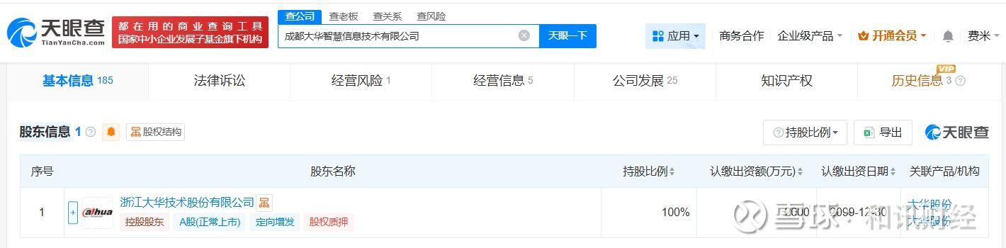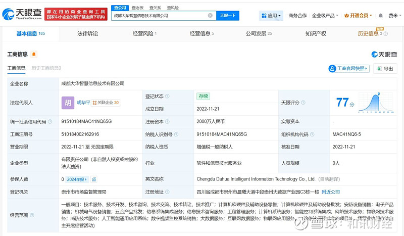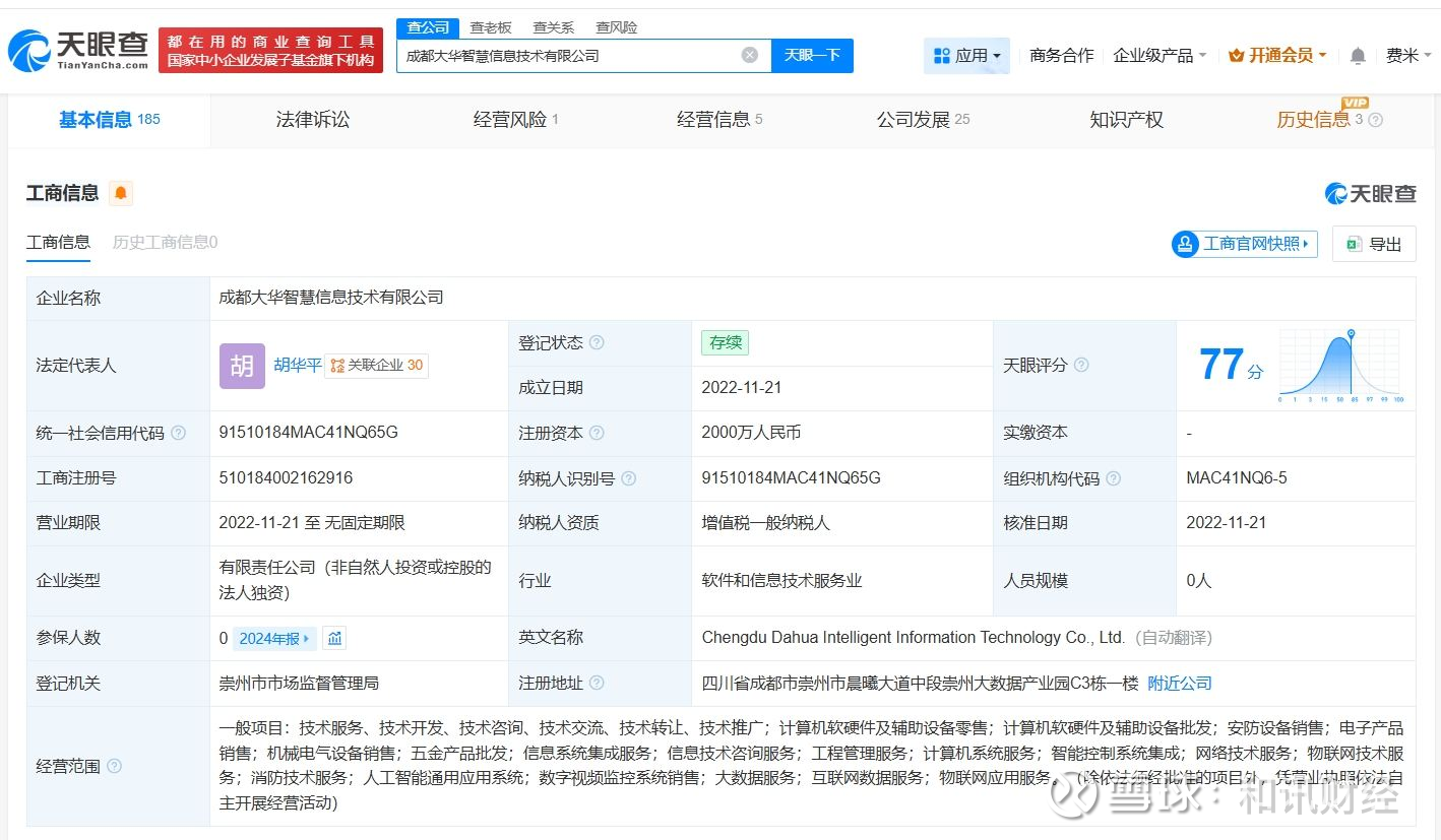 该公司成立于2022年11月,法定代表人为胡华平,注册资本2000万人民币,经营范围包括计算机软硬件及辅助设备零售、计算机软硬件及辅助设备批发、安防设备销售等,由大华股份(002236)全资持股。