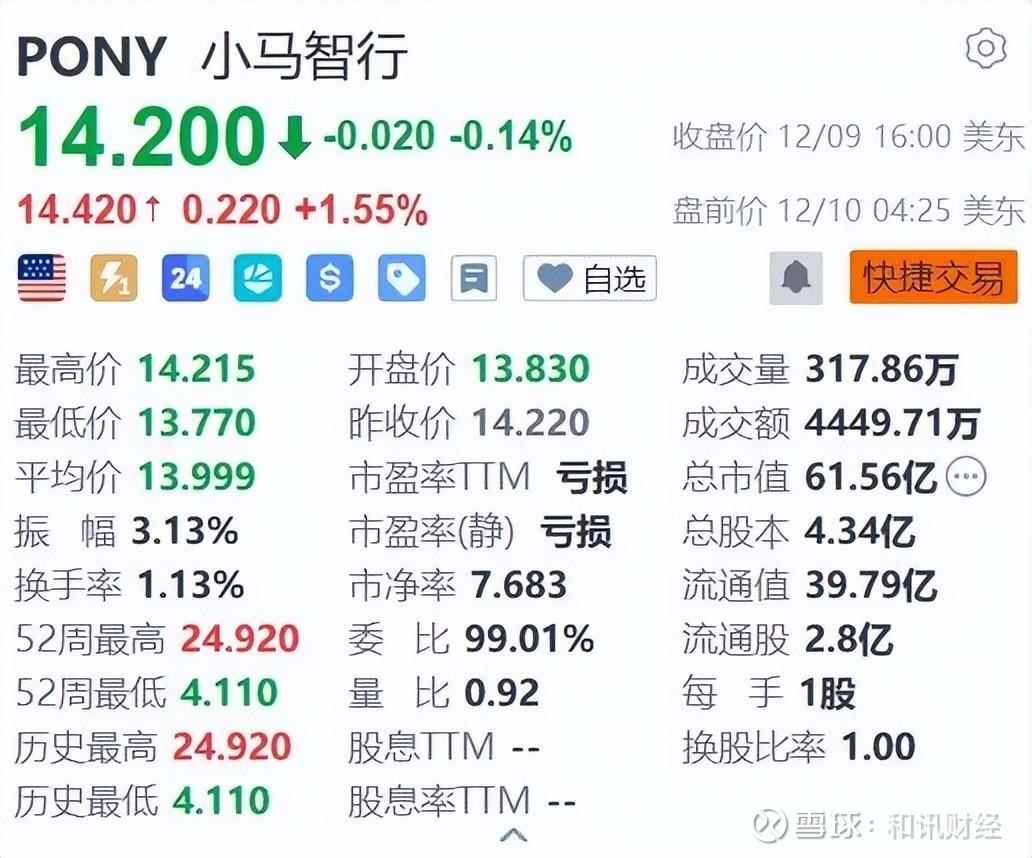 格隆汇12月10日|小马智行(PONY.US)盘前涨1.55%,报14.42美元。消息面上,由三一重卡与小马智行共同研发的第四代自动驾驶重卡已接近量产就绪状态,首批车辆定于明年投入商业运营。(格隆汇)