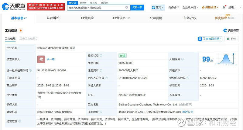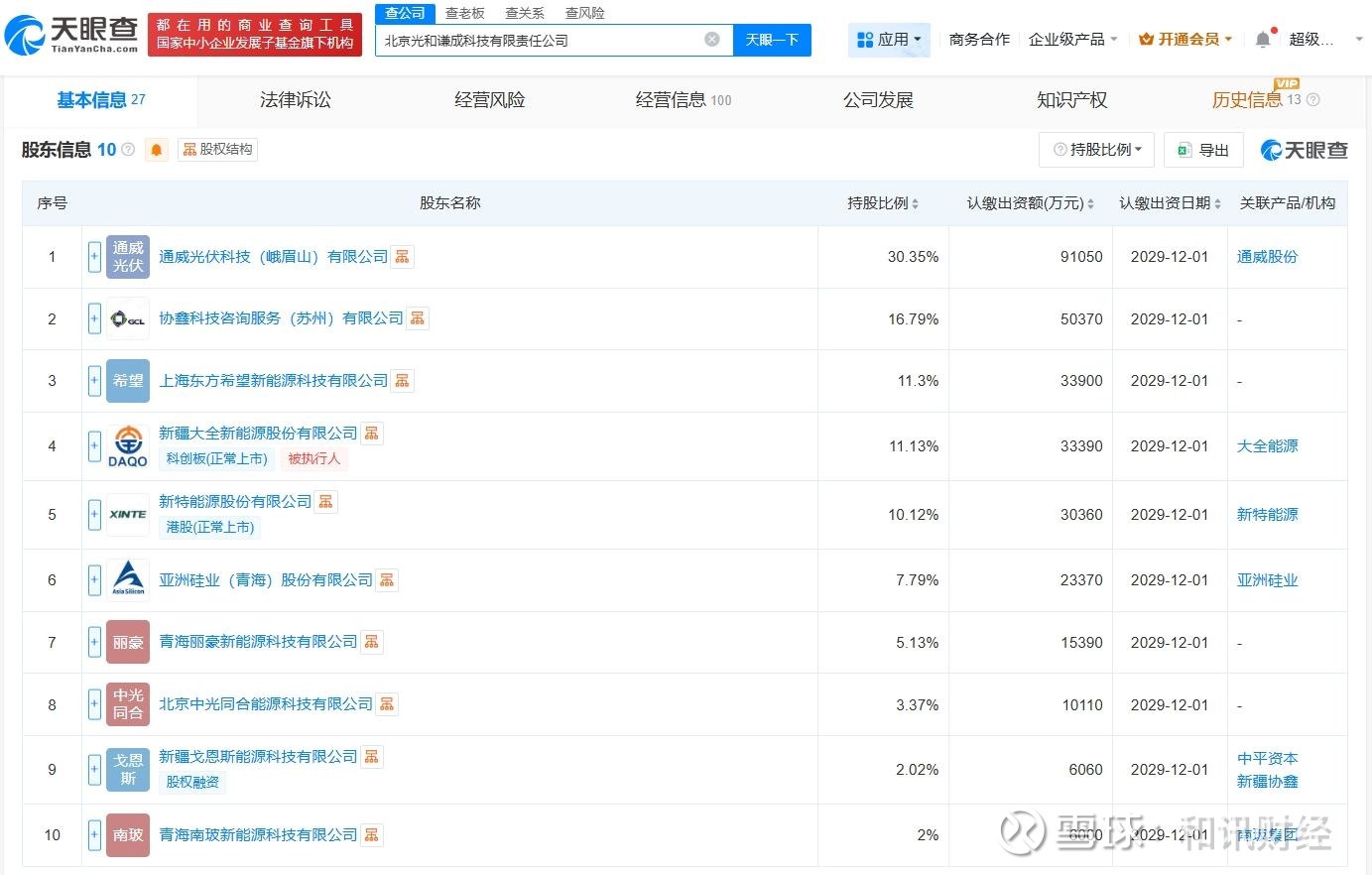 天眼查工商信息显示,近日,北京光和谦成科技有限责任公司成立,法定代表人为侯一聪,注册资本30亿人民币,经营范围包括企业管理咨询等。股东信息显示,该公司由通威股份旗下通威光伏科技(峨眉山)有限公司、协鑫科技咨询服务(苏州)有限公司、大全能源(688303)等共同持股。