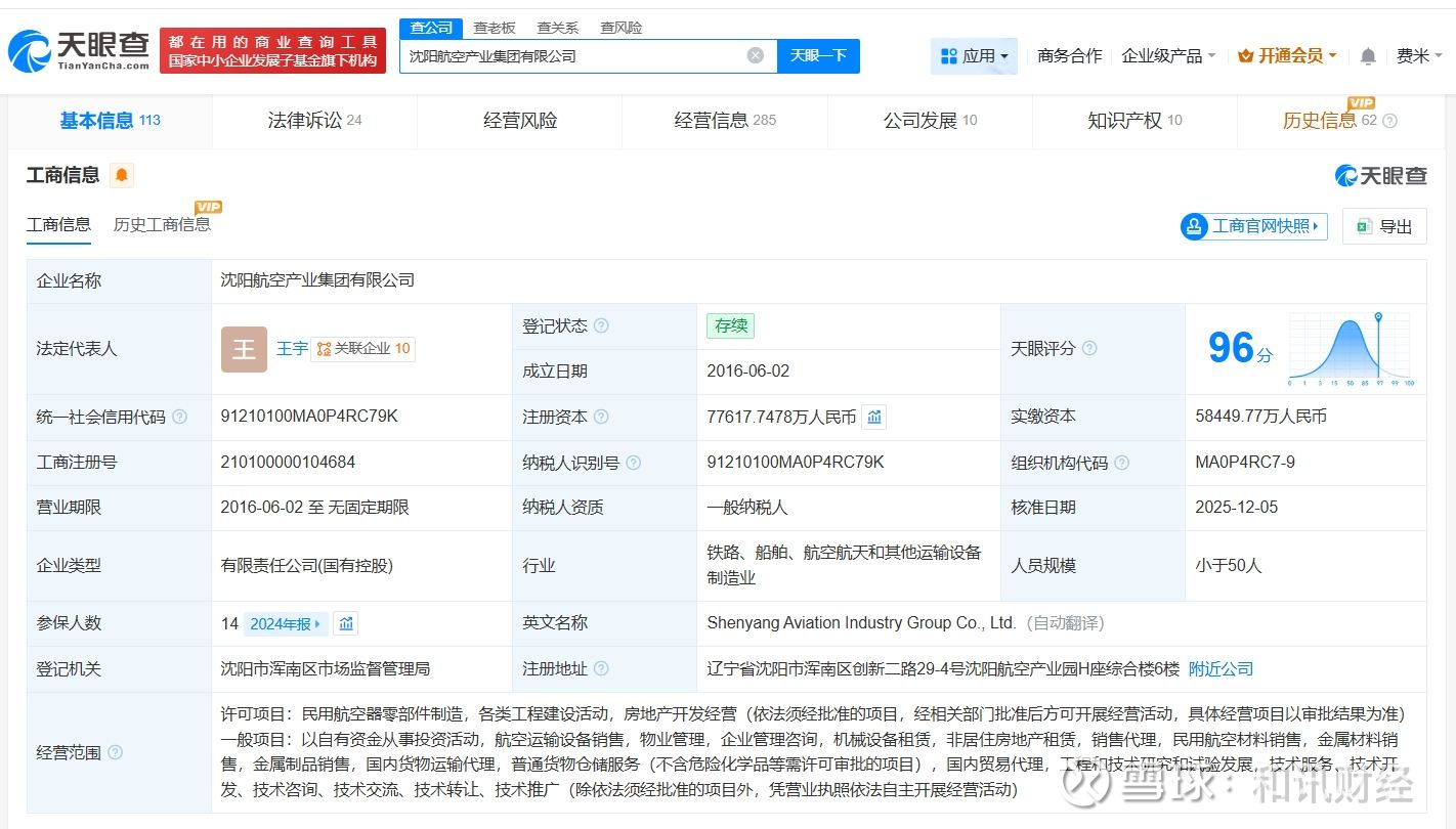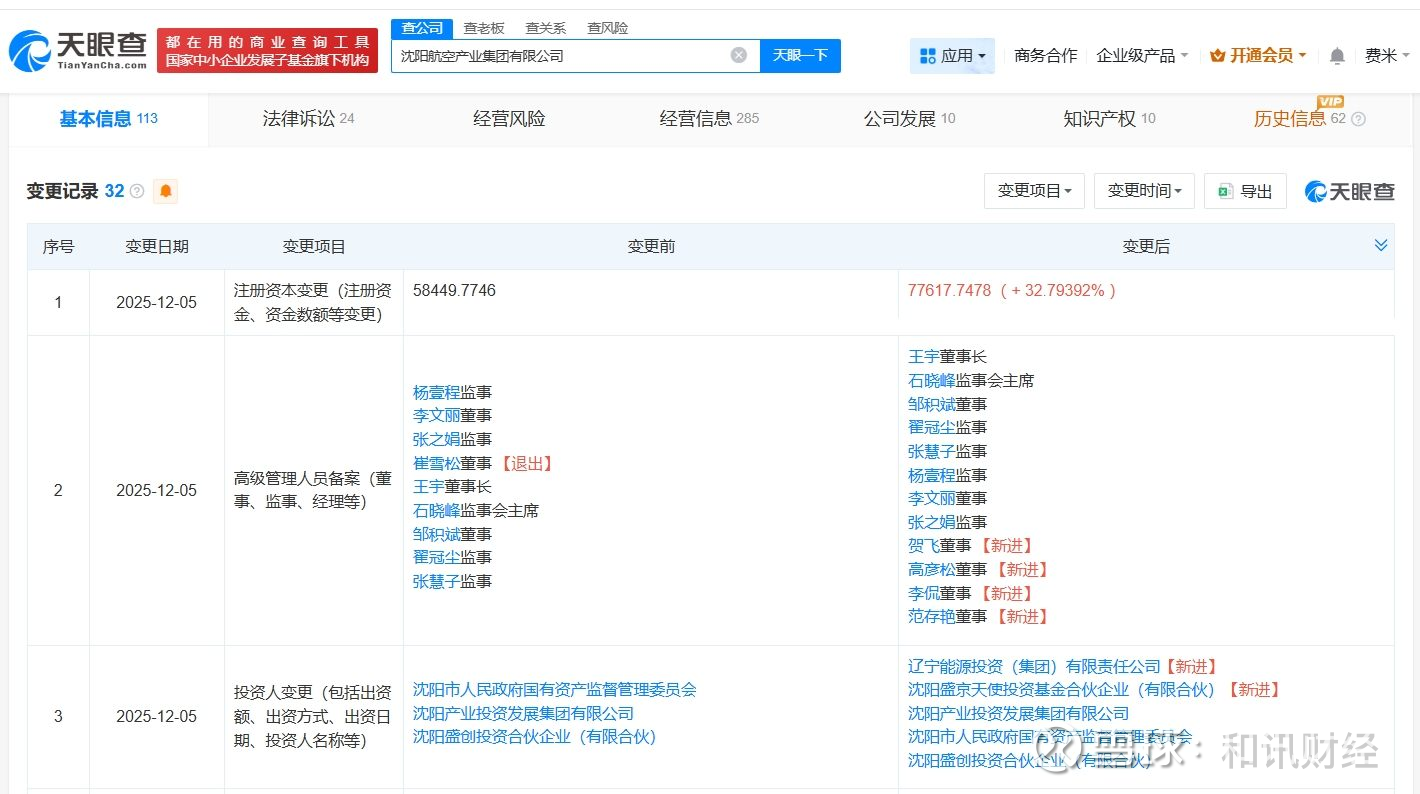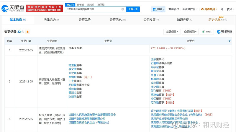 天眼查App显示,近日,沈阳航空产业集团有限公司发生工商变更,新增辽宁能源投资(集团)有限责任公司、沈阳盛京天使投资基金合伙企业(有限合伙)为股东,注册资本由约5.84亿增至约7.76亿,增幅约33%,同时,多位高管发生变更。