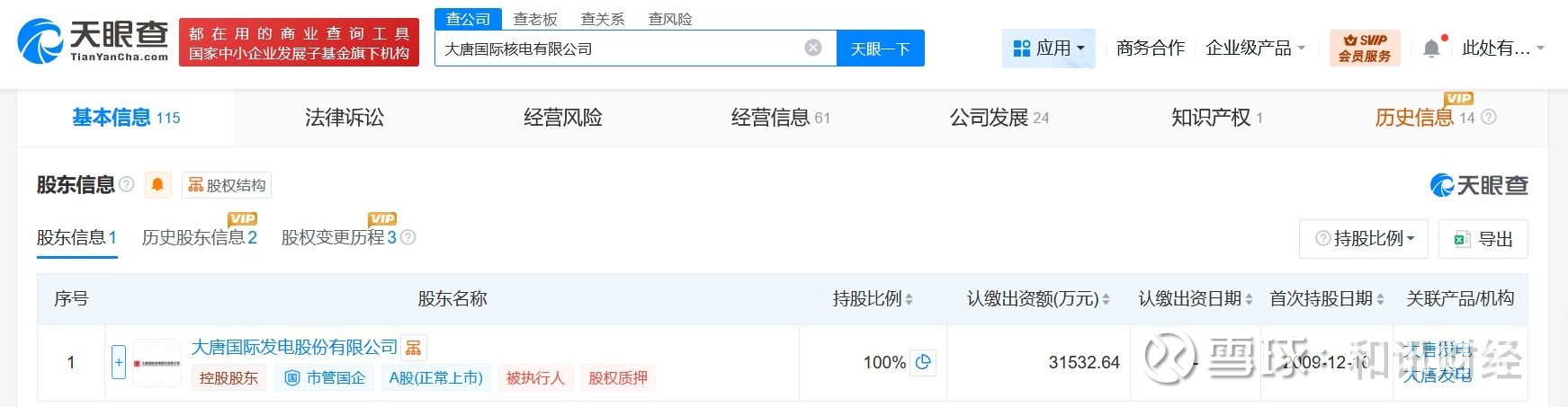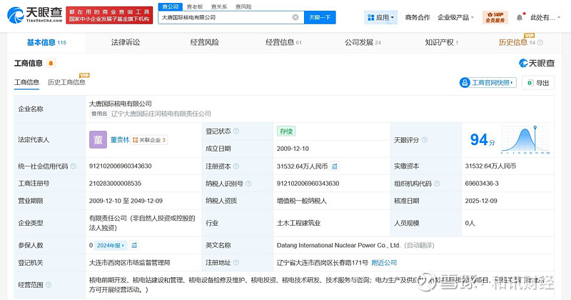 该公司成立于2009年12月,法定代表人为董贵林,经营范围为核电前期开发、核电站建设和管理、核电设备检修及维护、核电投资、核电技术研发、技术服务与咨询,电力生产及供应。股东信息显示,该公司由大唐发电(601991)全资持股。