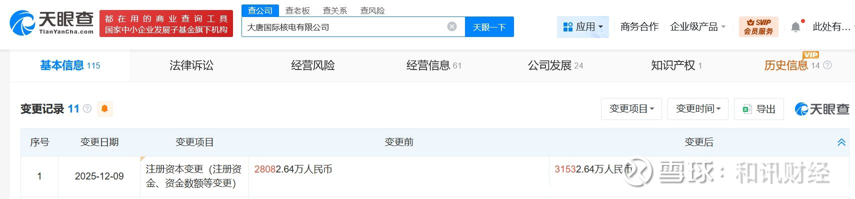 天眼查App显示,近日,大唐国际核电有限公司发生工商变更,注册资本由约2.8亿人民币增至约3.15亿人民币,增幅12.5%。