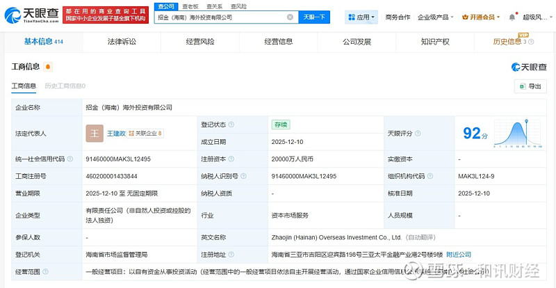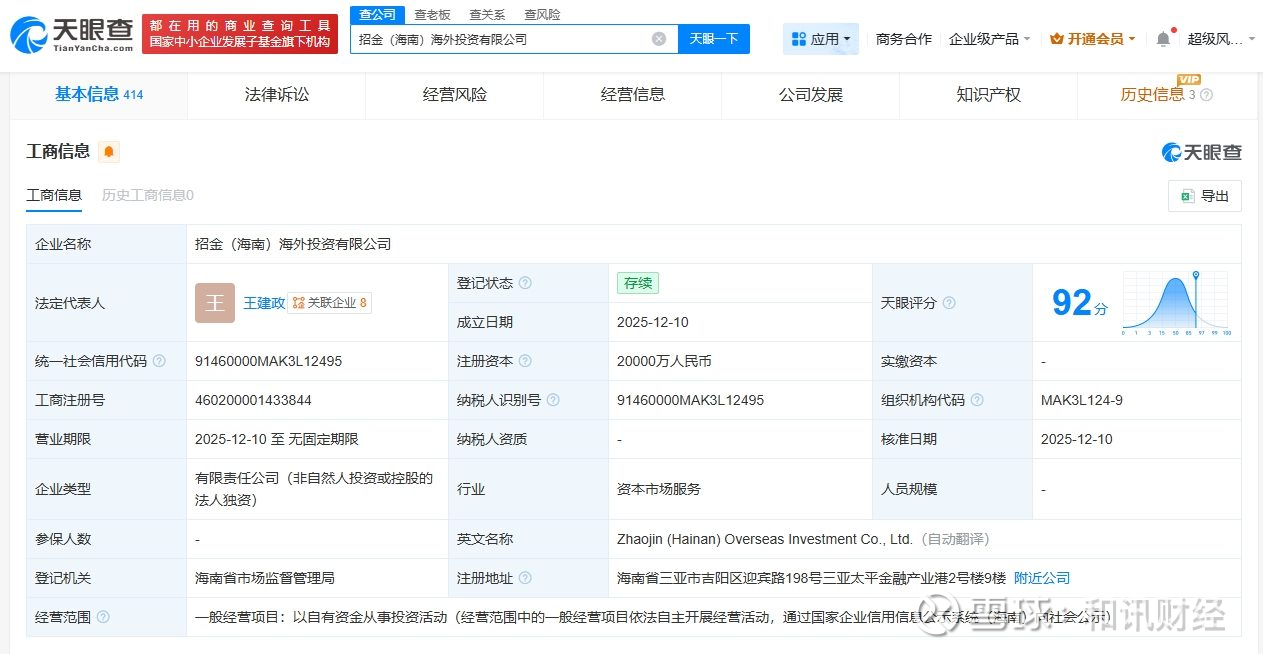 天眼查App显示,近日,招金(海南)海外投资有限公司成立,法定代表人为王建政,注册资本2亿人民币,经营范围为以自有资金从事投资活动。股权全景穿透图显示,该公司由招金矿业(01818.HK)旗下招金(海南)国际控股有限公司全资持股。
