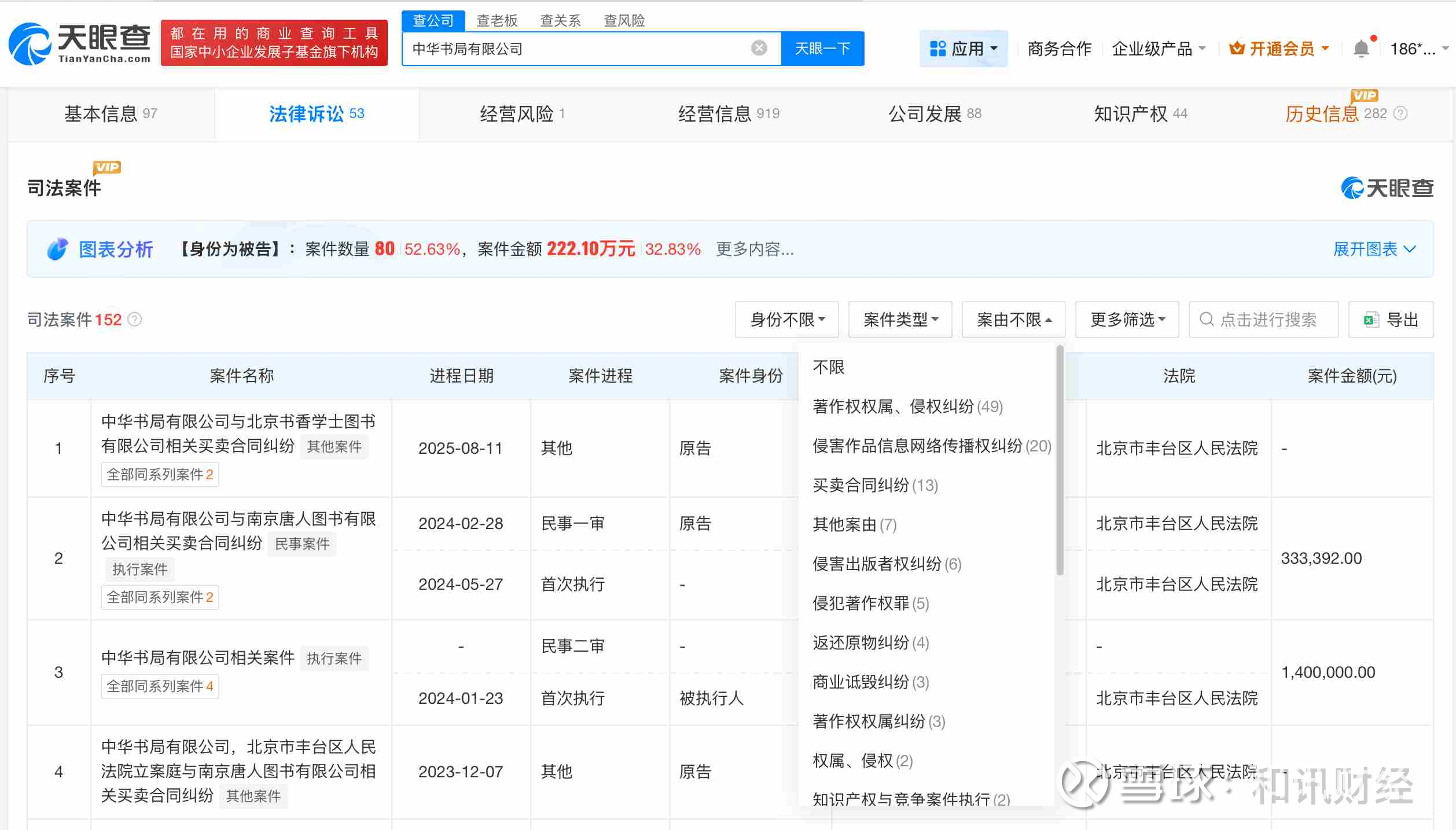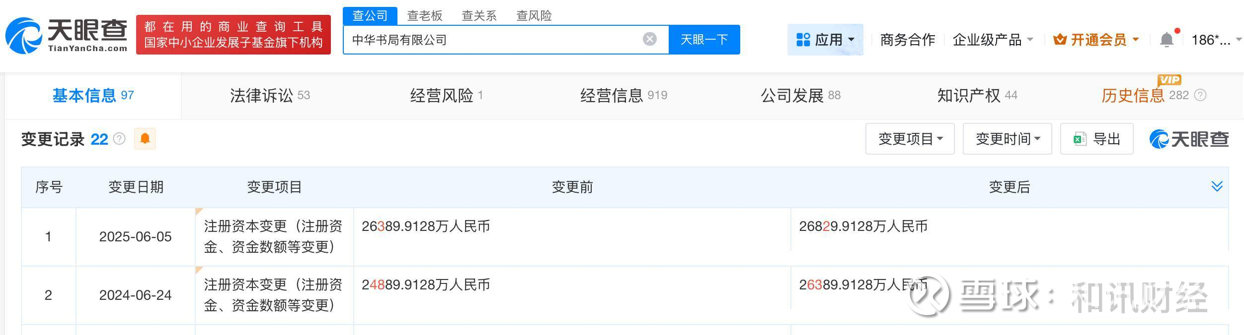 天眼查工商信息显示,中华书局有限公司成立于1998年7月,法定代表人为肖启明,注册资本约2.7亿人民币,经营范围包括图书出版、出版物批发、出版物零售等。股东信息显示,该公司由中国出版(601949)全资持股。变更记录显示,今年6月,该公司注册资本由约2.64亿人民币增至约2.68亿人民币。天眼风险信息显示,该公司涉及多起法律诉讼,案由包括著作权权属、侵权纠纷等。