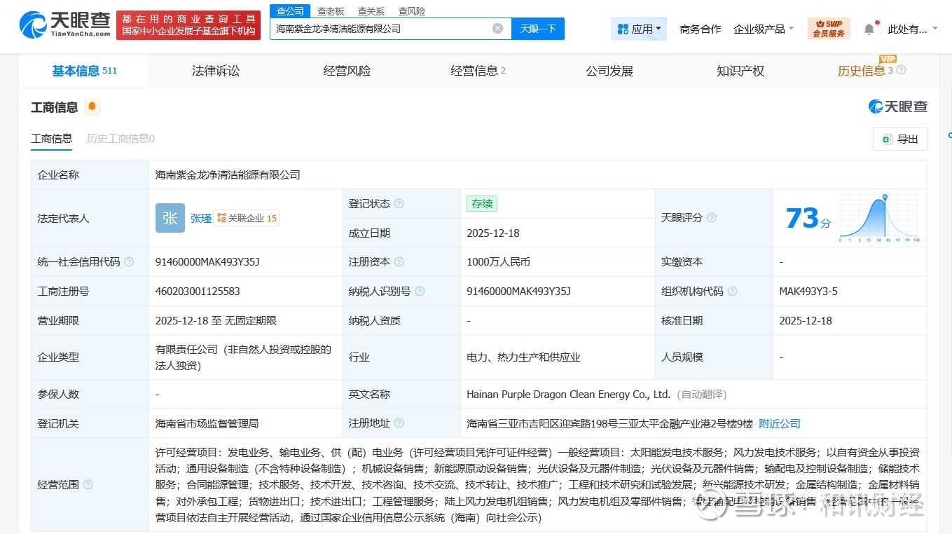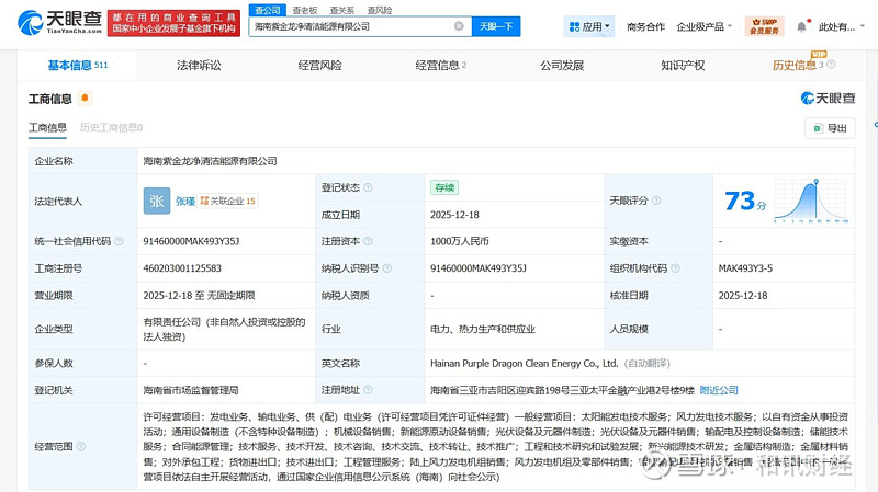 天眼查App显示,近日,海南紫金龙净清洁能源有限公司成立,法定代表人为张瑾,注册资本1000万人民币,经营范围含发电业务、输电业务、供(配)电业务,太阳能发电技术服务,风力发电技术服务,以自有资金从事投资活动,通用设备制造,机械设备销售,新能源原动设备销售,光伏设备及元器件制造等,由龙净环保(600388)全资持股。