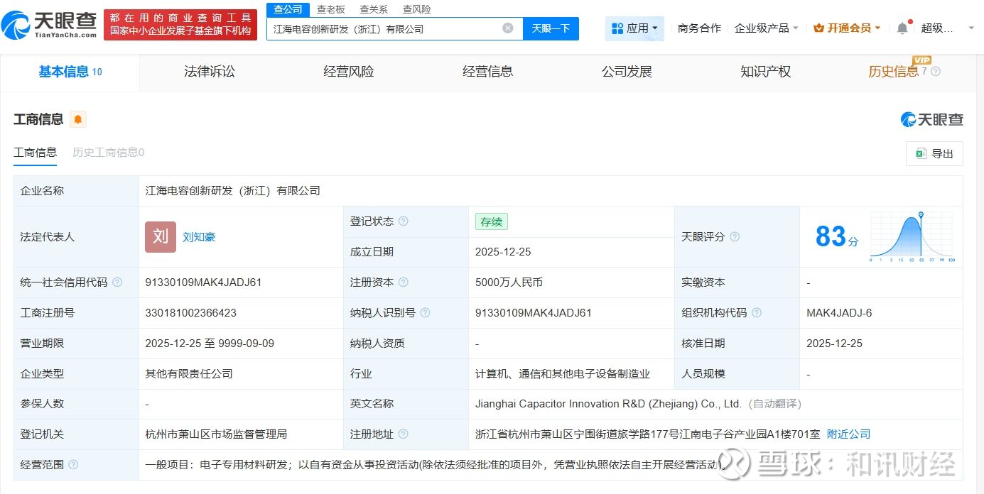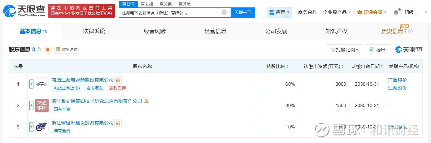 天眼查App显示,近日,江海电容创新研发(浙江)有限公司成立,法定代表人为刘知豪,注册资本5000万人民币,经营范围包括电子专用材料研发、以自有资金从事投资活动。股东信息显示,该公司由江海股份(002484)、浙江省交通集团技术研究总院有限责任公司、浙江省经济建设投资有限公司共同持股。