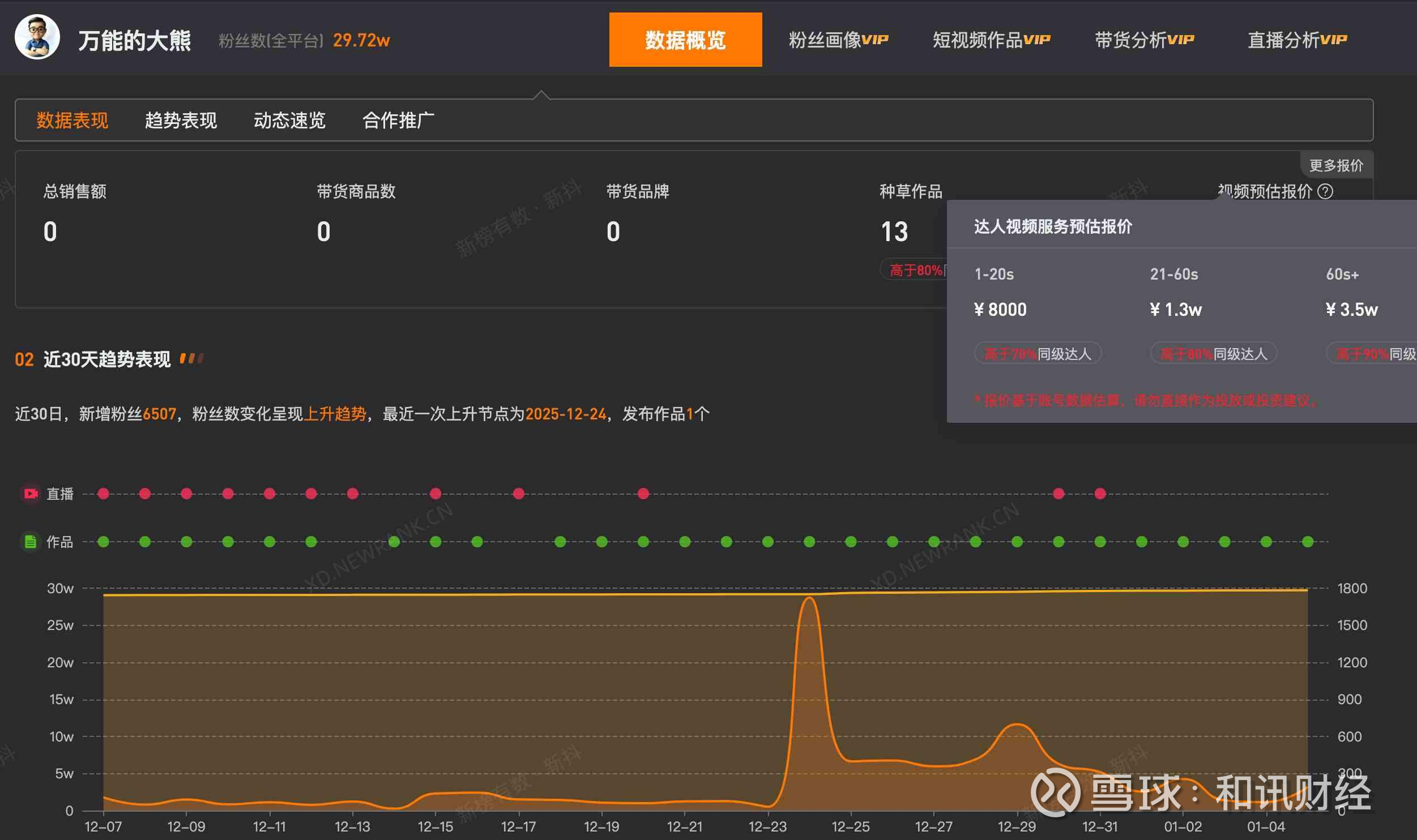 第三方数据显示,“万能的大熊”1-20s视频广告报价为8000,21-60s视频广告报价为1.3万,60s以上视频广告报价为3.5万。
