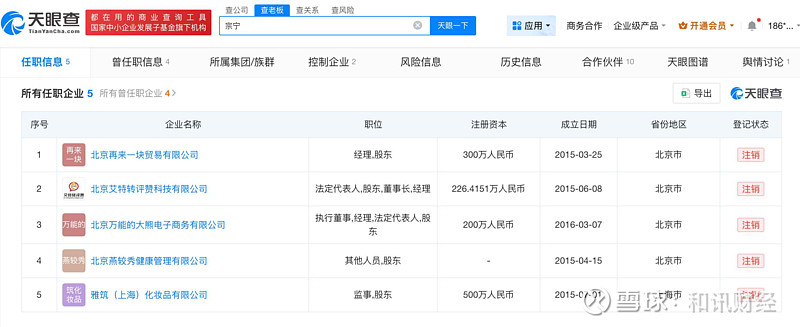 天眼查App显示,宗宁关联的5家企业均已注销,包括北京再来一块贸易有限公司、北京艾特转评赞科技有限公司等,涉及贸易、科技、商务等领域,宗宁在上述企业担任董事长、经理等职务。
