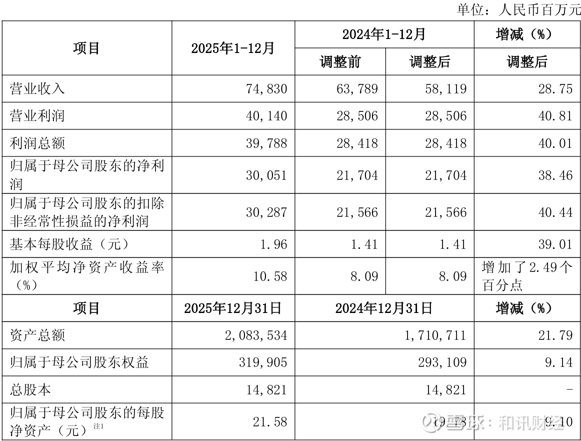中信证券(600030.SH)发布2025年度业绩快报。2025年实现营业收入748.30亿元,同比增长28.75%;归属于母公司股东的净利润为300.51亿元,同比增长38.46%。