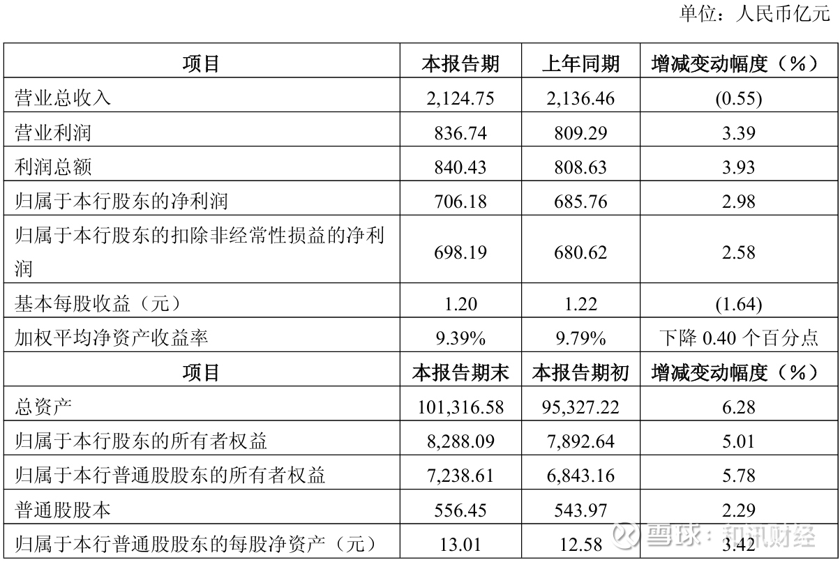 截至2025年末,本行不良贷款率1.15%,比上年末下降0.01个百分点;拨备覆盖率203.61%,比上年末下降5.82个百分点。截至2025年末,本行资产总额101,316.58亿元,比上年末增长6.28%;归属于本行普通股股东的所有者权益7,238.61亿元,比上年末增长5.78%。