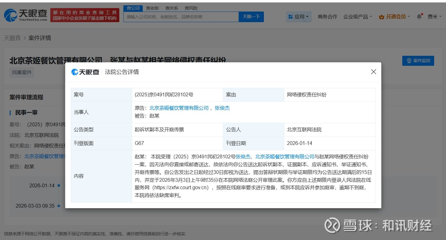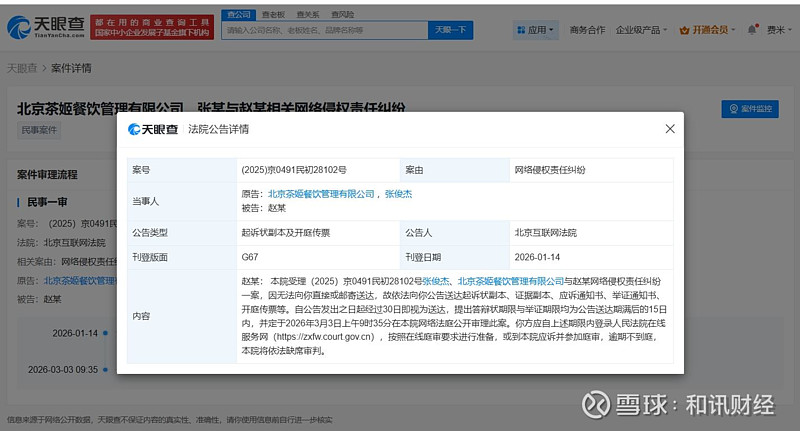 天眼查天眼风险信息显示,近日,北京互联网法院向赵某公告送达原告霸王茶姬关联公司北京茶姬餐饮管理有限公司、创始人张俊杰与其网络侵权责任纠纷案件起诉状副本、开庭传票等,自公告发出之日起经过30日即视为送达,该案将定于3月3日开庭审理。