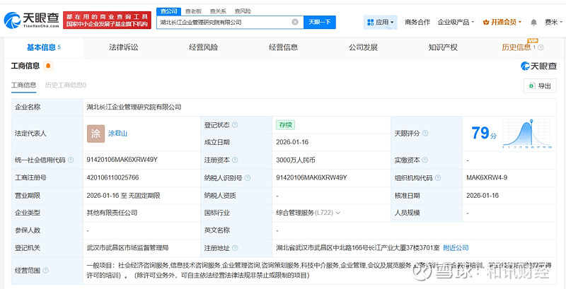 天眼查工商信息显示,近日,湖北长江企业管理研究院有限公司成立,法定代表人为涂君山,注册资本3000万人民币,经营范围包括社会经济咨询服务、信息技术咨询服务、企业管理咨询等。股权全景穿透图显示,该公司由湖北省投资公司、长江证券创新投资(湖北)有限公司、天风创新投资有限公司共同持股。