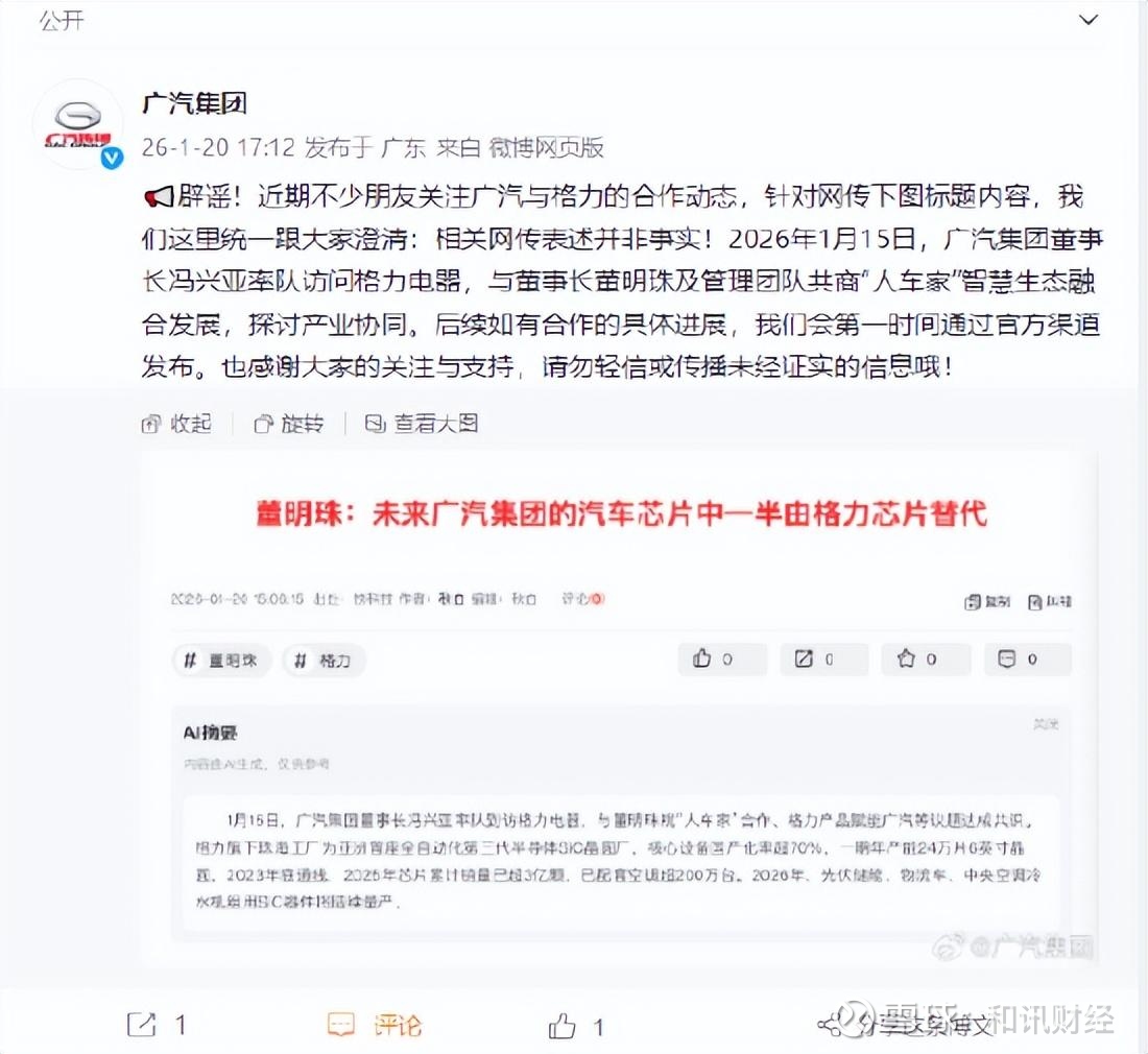 1月20日消息,广汽集团官微发布辟谣声明,针对网传《董明珠:未来广汽集团的汽车芯片中一半由格力芯片替代》,广汽集团表示,相关网传表述并非事实!2026年1月15日,广汽集团董事长冯兴亚率队访问格力电器,与董事长董明珠及管理团队共商“人车家”智慧生态融合发展,探讨产业协同。后续如有合作的具体进展,我们会第一时间通过官方渠道发布。也感谢大家的关注与支持,请勿轻信或传播未经证实的信息哦!