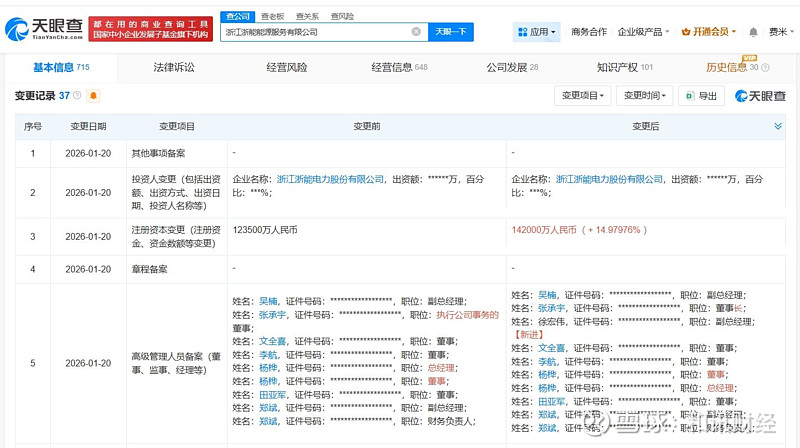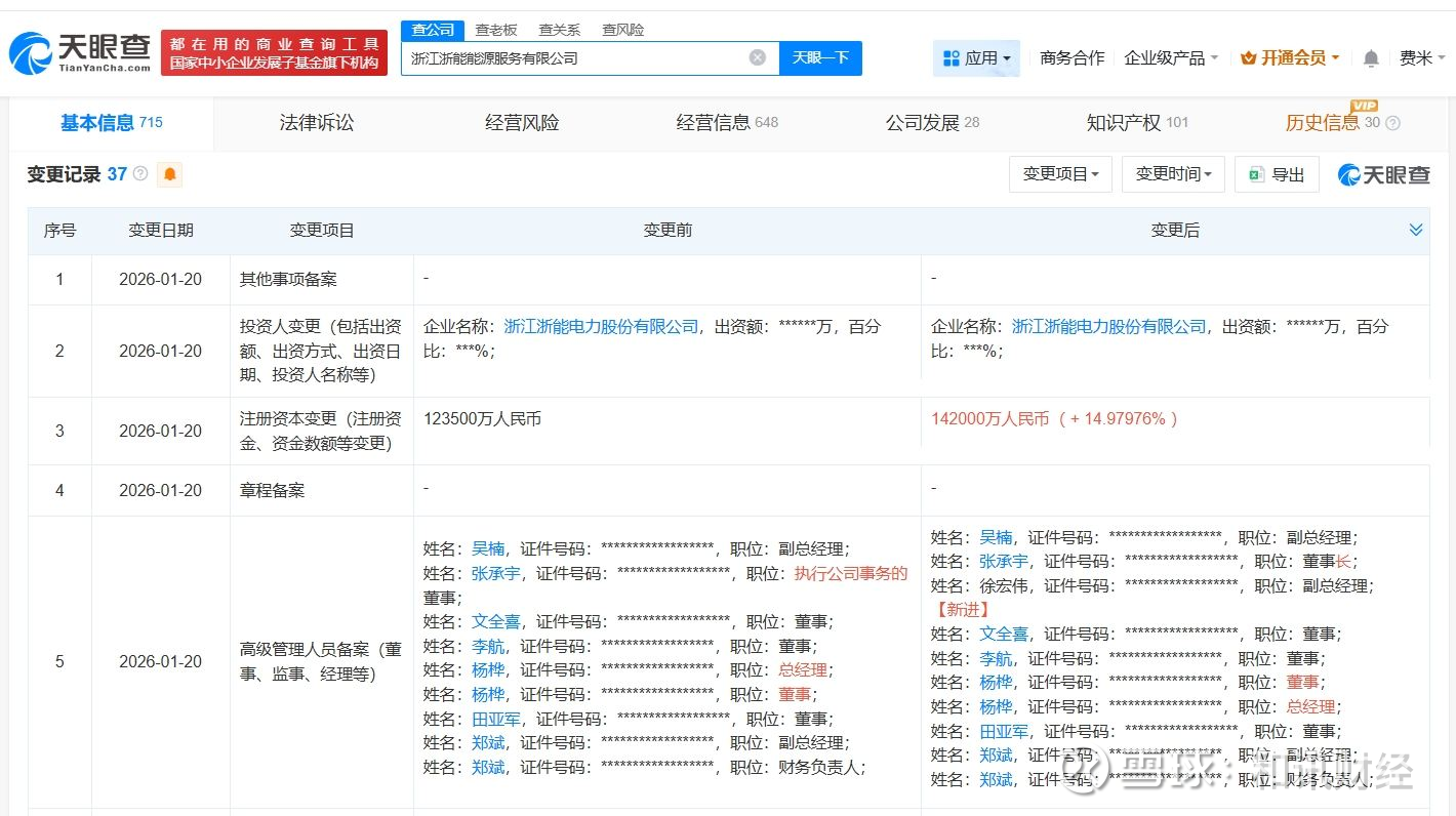 天眼查工商信息显示,近日,浙江浙能能源服务有限公司发生工商变更,注册资本由12.35亿人民币增至14.2亿人民币,增幅约15%,同时,部分主要人员发生变更。
