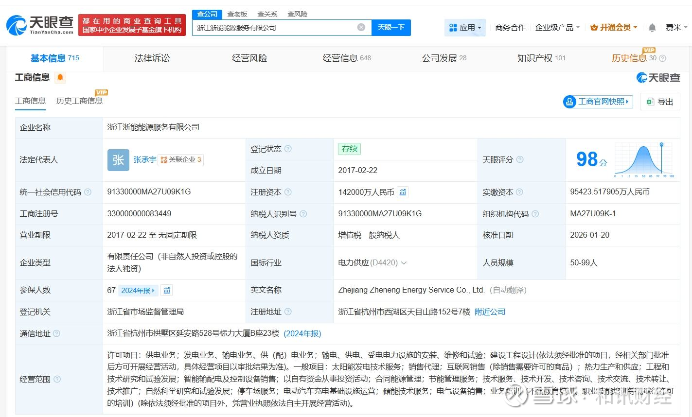 浙江浙能能源服务有限公司成立于2017年2月,法定代表人为张承宇,经营范围包括供电业务、发电业务、输电业务、供(配)电业务等。股东信息显示,该公司由浙能电力(600023)全资持股。