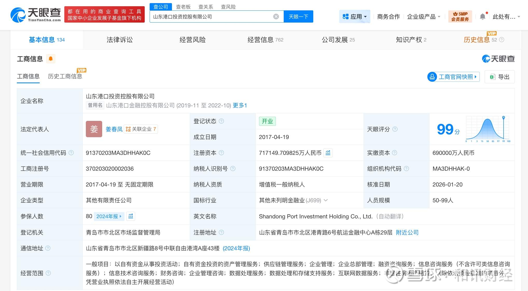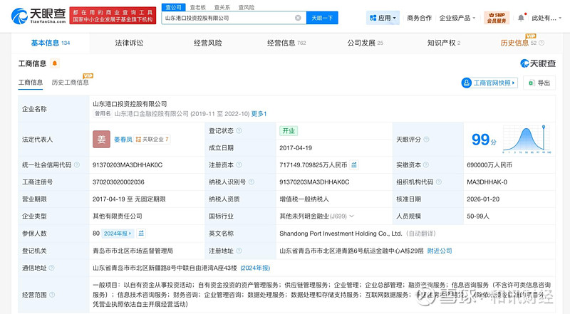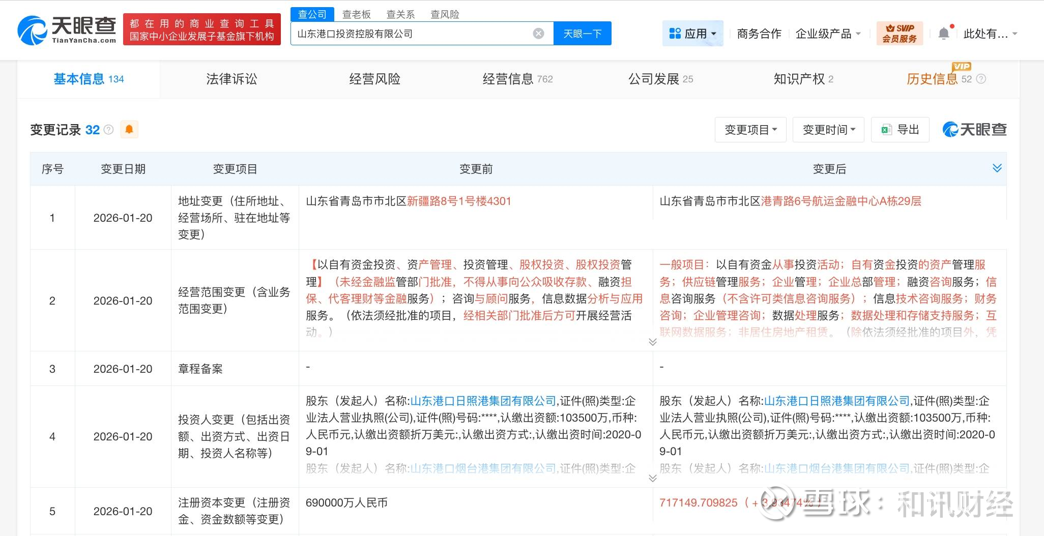天眼查工商信息显示,近日,山东港口投资控股有限公司发生工商变更,注册资本由69亿人民币增至约71.7亿人民币,增幅约4%。