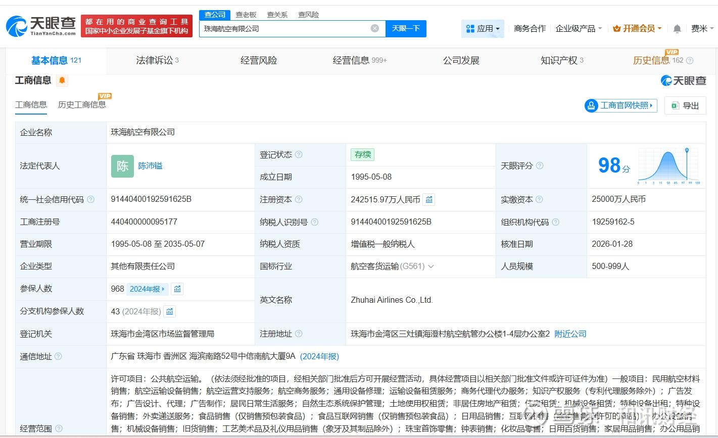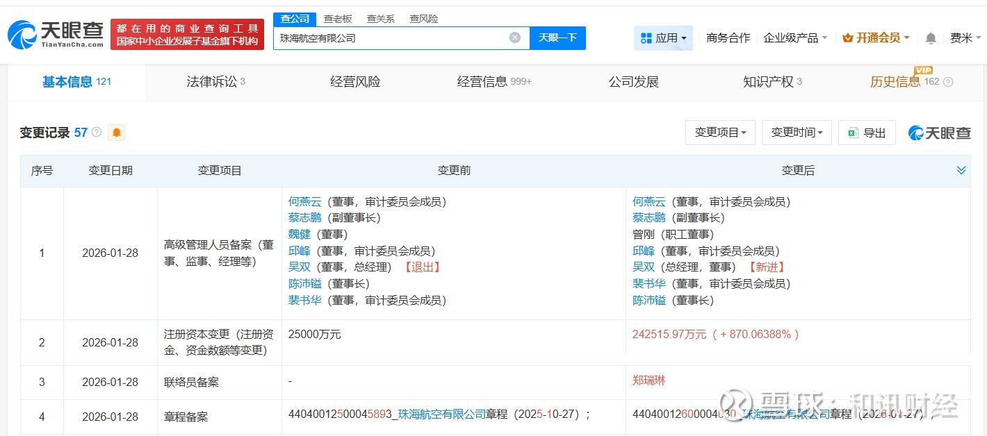 天眼查App显示,近日,珠海航空有限公司发生工商变更,注册资本由2.5亿增至约24.3亿人民币,增幅约870%。
