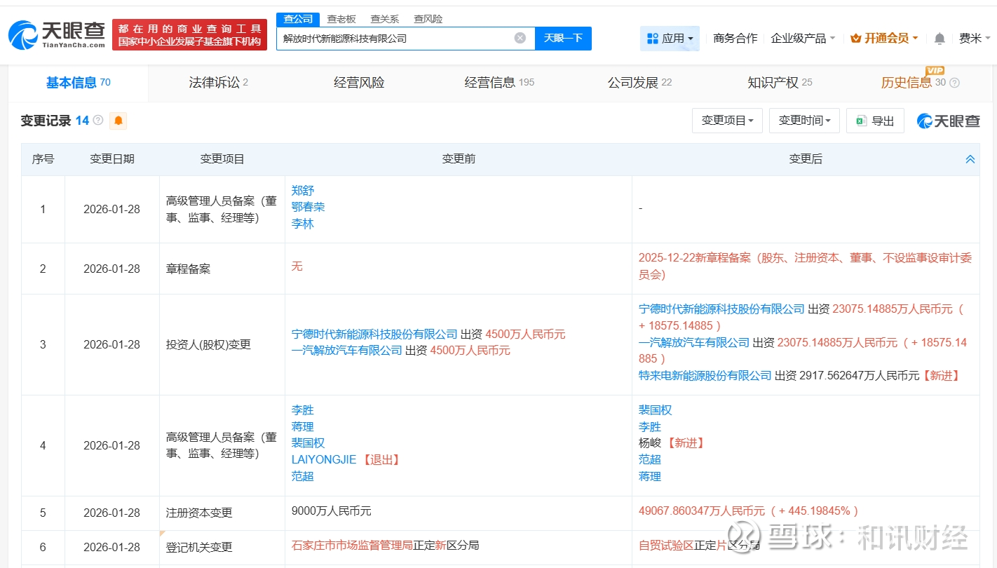 天眼查App显示,近日,解放时代新能源科技有限公司发生工商变更,新增特来电新能源股份有限公司为股东,同时,注册资本由9000万人民币增至约4.9亿人民币。