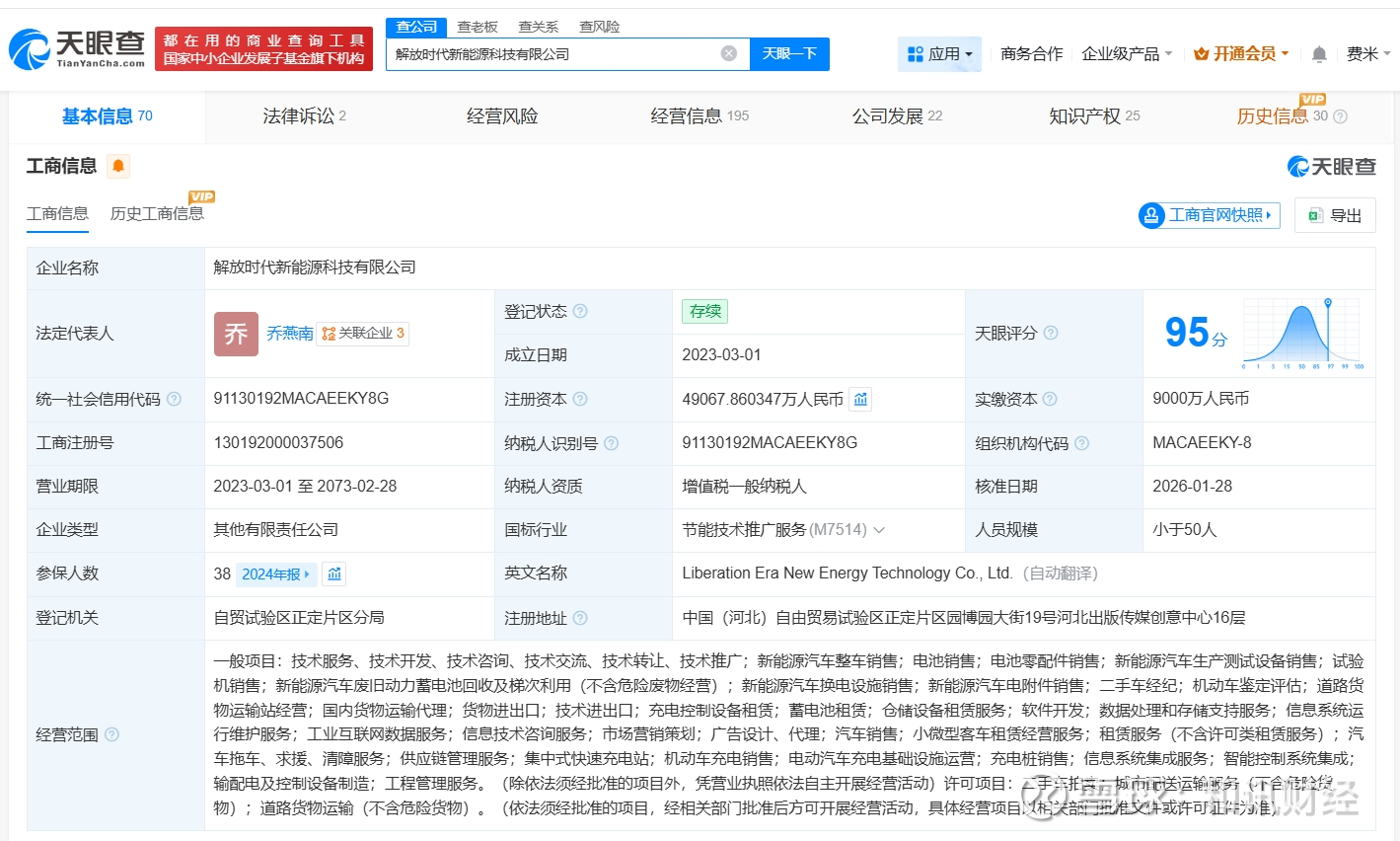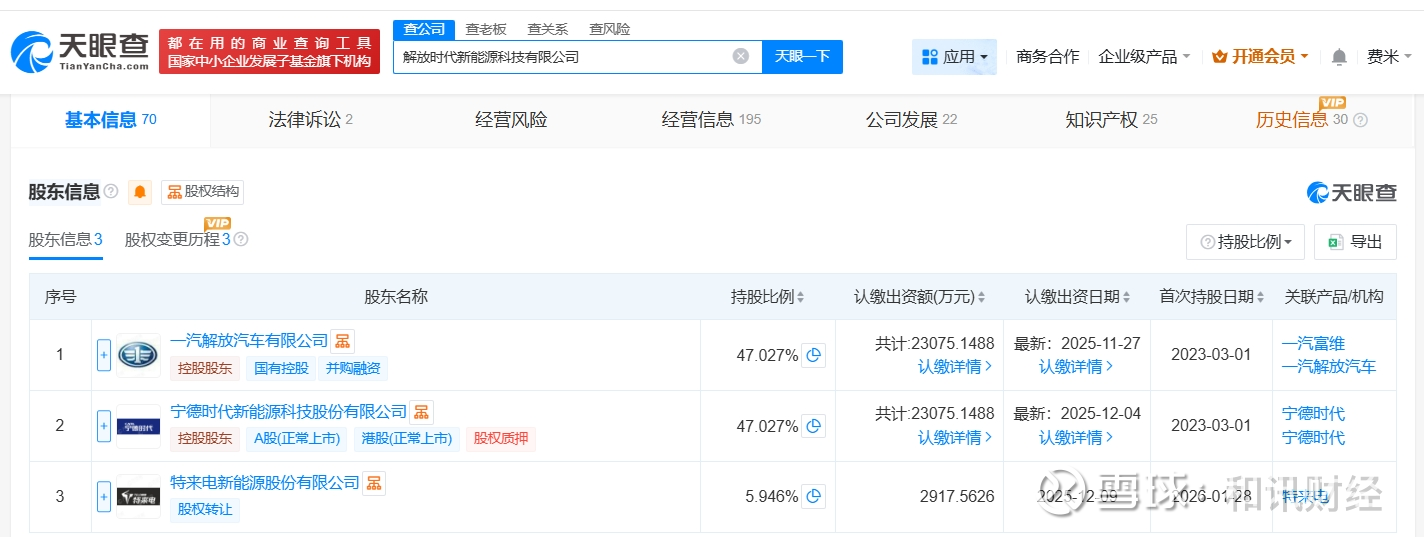 该公司成立于2023年3月,法定代表人为乔燕南,经营范围包括新能源汽车整车销售、电池销售、电池零配件销售等,现由一汽解放汽车有限公司、宁德时代(300750)及上述新增股东共同持股。