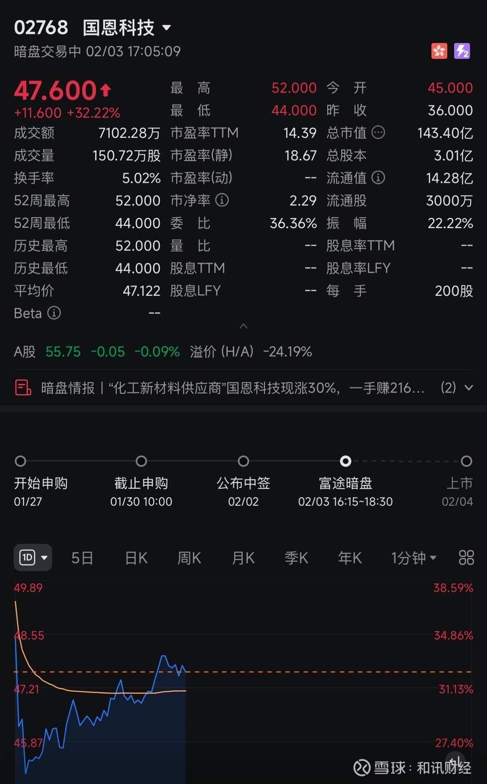 国恩科技(02768)将于2月4日(星期三)在香港挂牌。截至发稿,富途证券暗盘交易显示报价47.6港元,较招股价36港元上涨32.22%,每手200股,不计手续费,每手赚2320港元