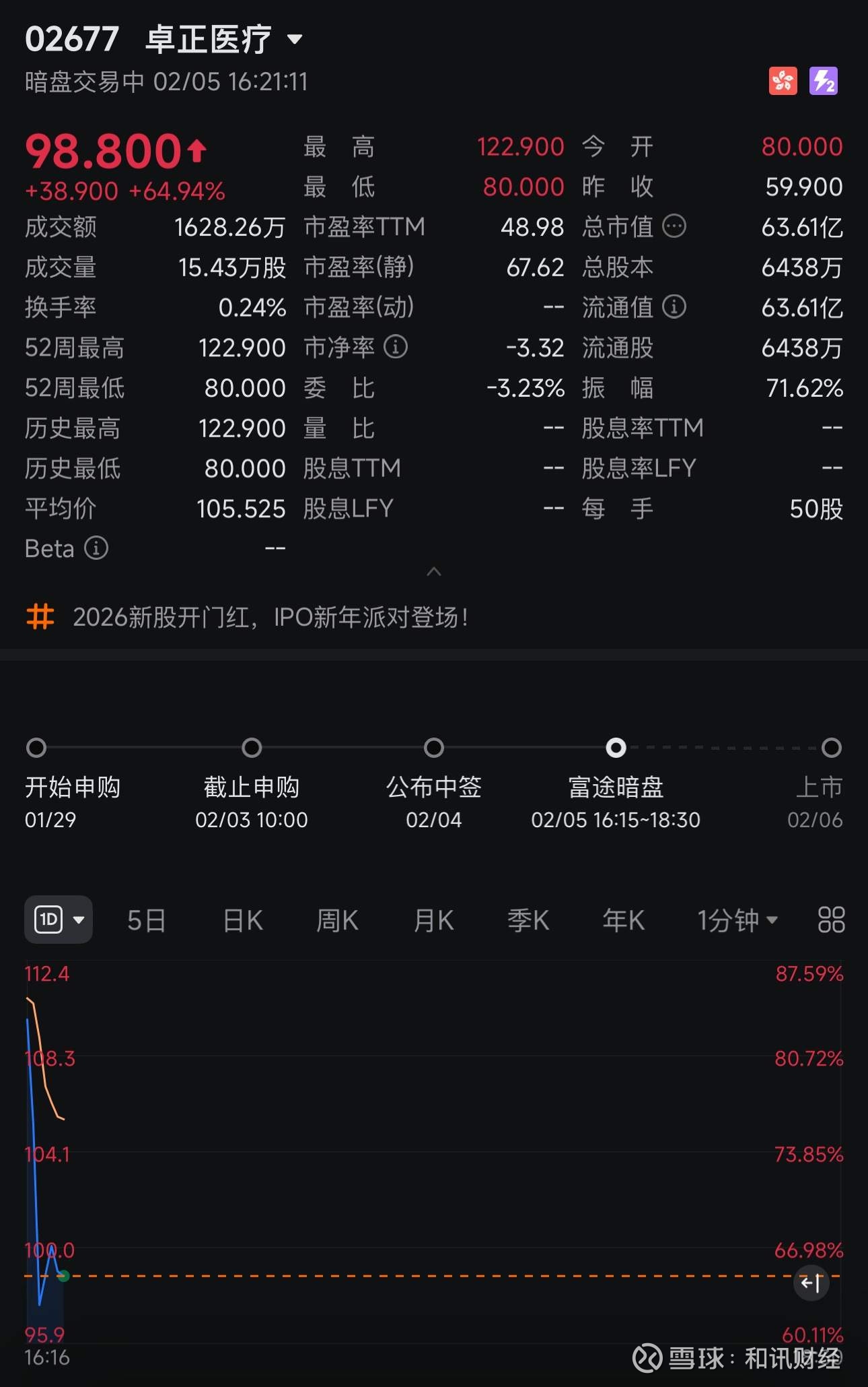 富途证券暗盘最新交易显示报价98.8港元,较招股价59.9港元上涨64.94%,每手50股,不计手续费,每手赚1945港元;富途证券暗盘显示公司股价一度涨至122.9港元,较招股价59.9港元最高上涨105%,每手50股,不计手续费,每手最高赚3150港元。截止发稿,卓正医疗暗盘最新价98.8港元,涨幅64.94%,总市值63.61港元。
