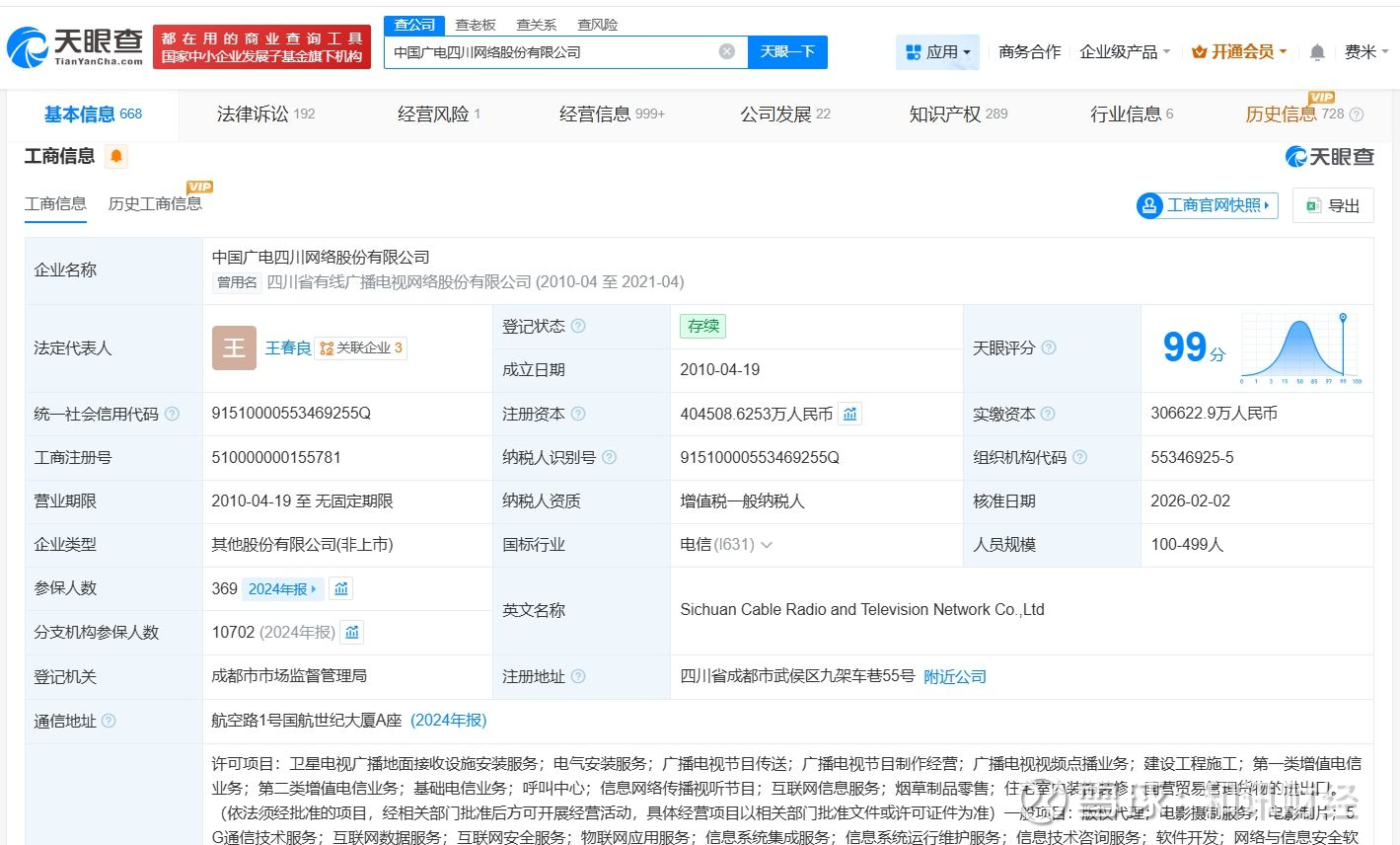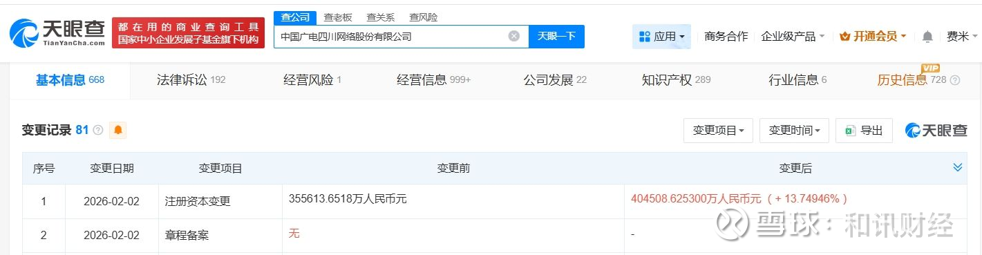 天眼查App显示,近日,中国广电四川网络股份有限公司发生工商变更,注册资本由约35.6亿人民币增至约40.5亿人民币,增幅约14%。