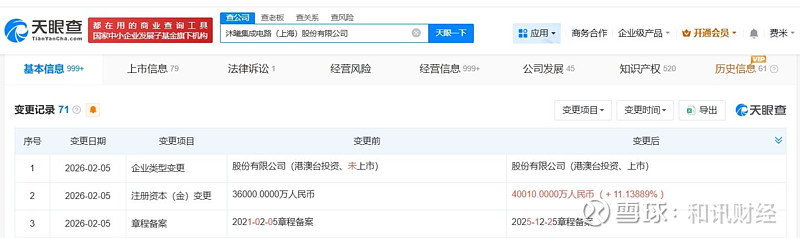 天眼查App显示,近日,沐曦股份(688802)发生工商变更,注册资本由3.6亿人民币增至约4亿人民币,增幅约11%。