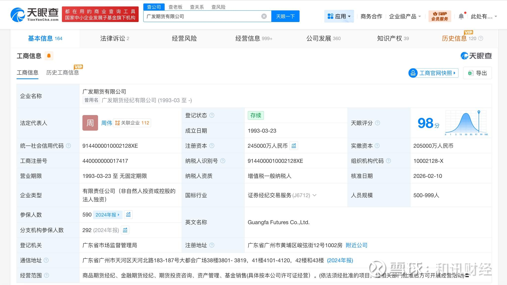 该公司成立于1993年3月,法定代表人为周伟,经营范围为商品期货经纪、金融期货经纪、期货投资咨询、资产管理、基金销售。股东信息显示,该公司由广发证券(000776)全资持股。