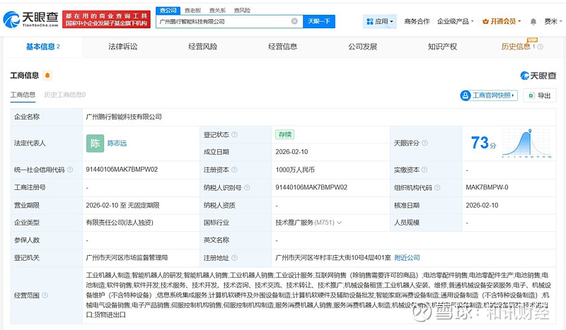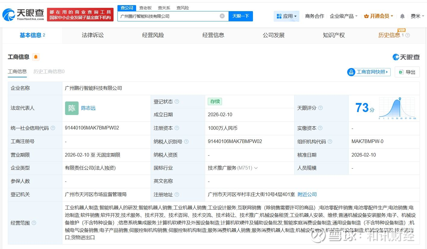 天眼查App显示,近日,广州鹏行智能科技有限公司成立,法定代表人为陈志远,注册资本1000万人民币,经营范围包括工业机器人制造、智能机器人的研发、智能机器人销售、工业机器人销售等,由广州小鹏汽车科技有限公司全资持股。