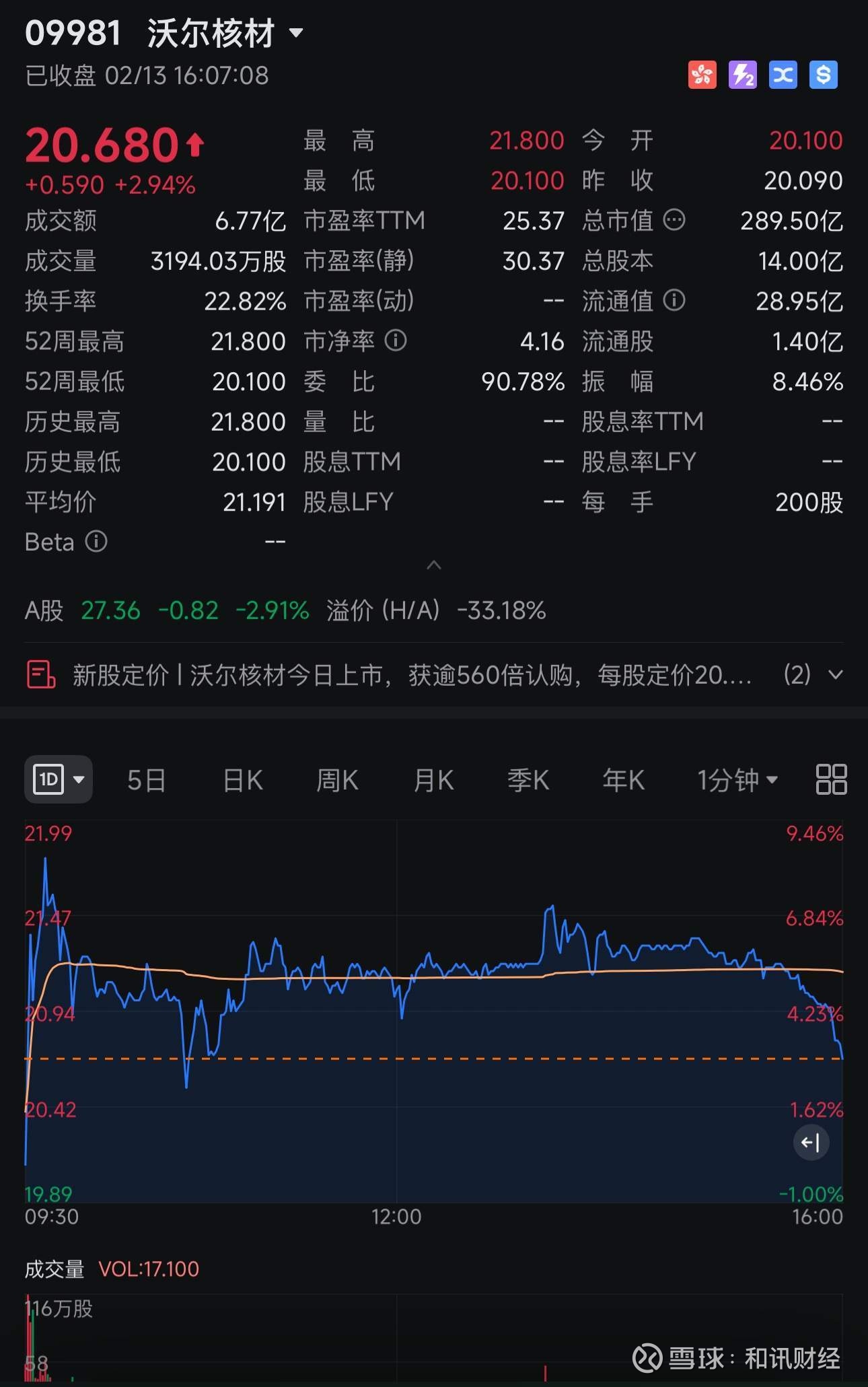招股价:20.09港元;开盘价:20.1港元;收盘价:20.68港元;涨幅:2.94%