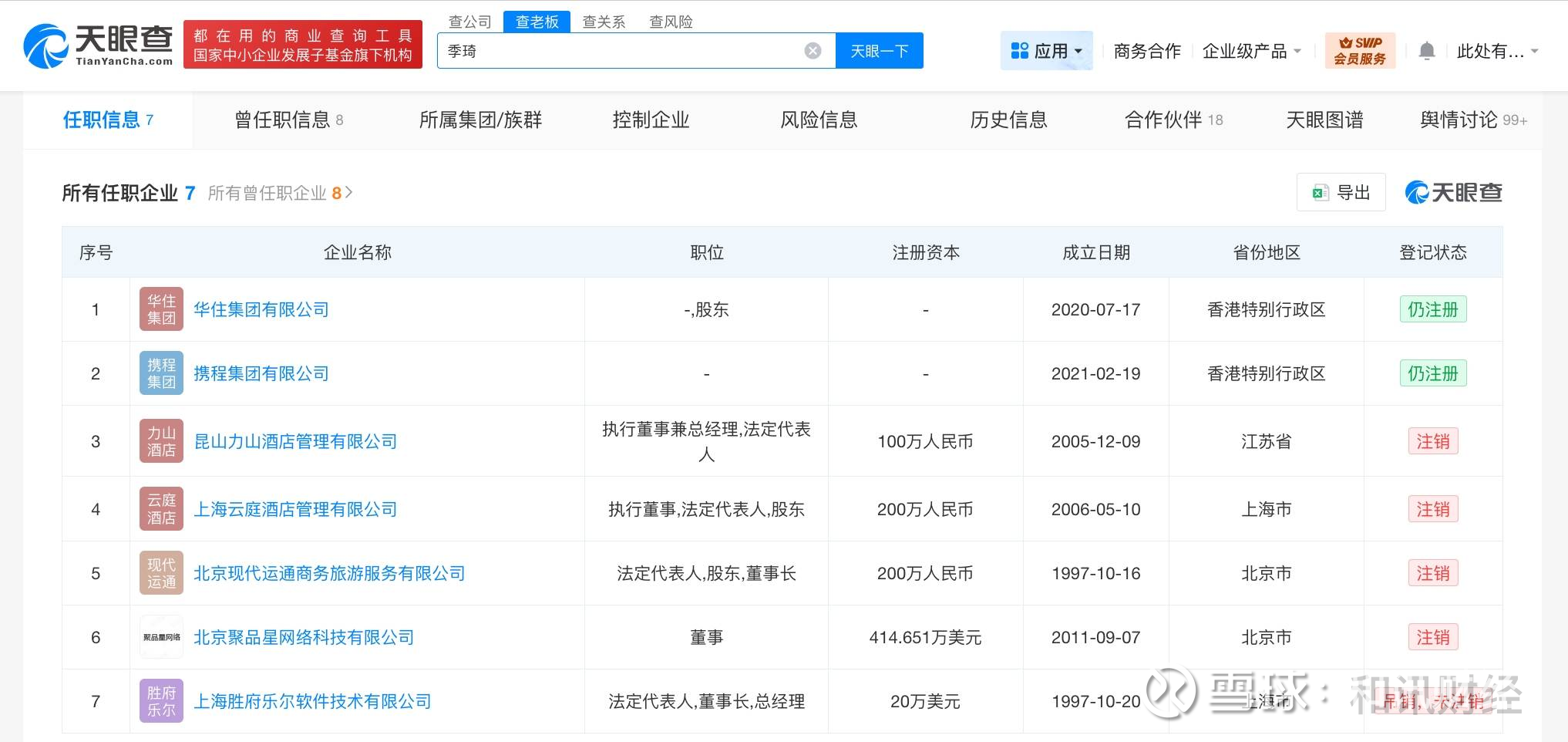 天眼查App显示,范敏名下关联59家企业,包括携程集团有限公司、携程旅游信息技术(上海)有限公司、携程旅游网络技术(上海)有限公司、携程计算机技术(上海)有限公司、成都携程信息技术有限公司等多家携程旗下公司等,范敏在上述公司担任执行董事、总经理、法定代表人等。季琦名下关联华住集团有限公司、携程集团有限公司等。