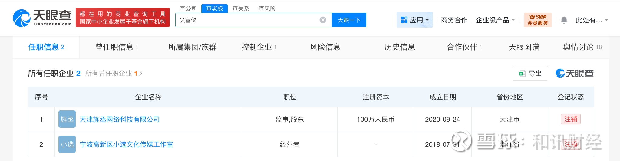 天眼查工商信息显示,吴宣仪名下关联2家企业,分别为天津旌丞网络科技有限公司、宁波高新区小选文化传媒工作室,不过上述企业均已注销。值得一提的是,吴宣仪与乐华娱乐关联公司北京乐华圆娱文化传播有限公司无直接商业关联。