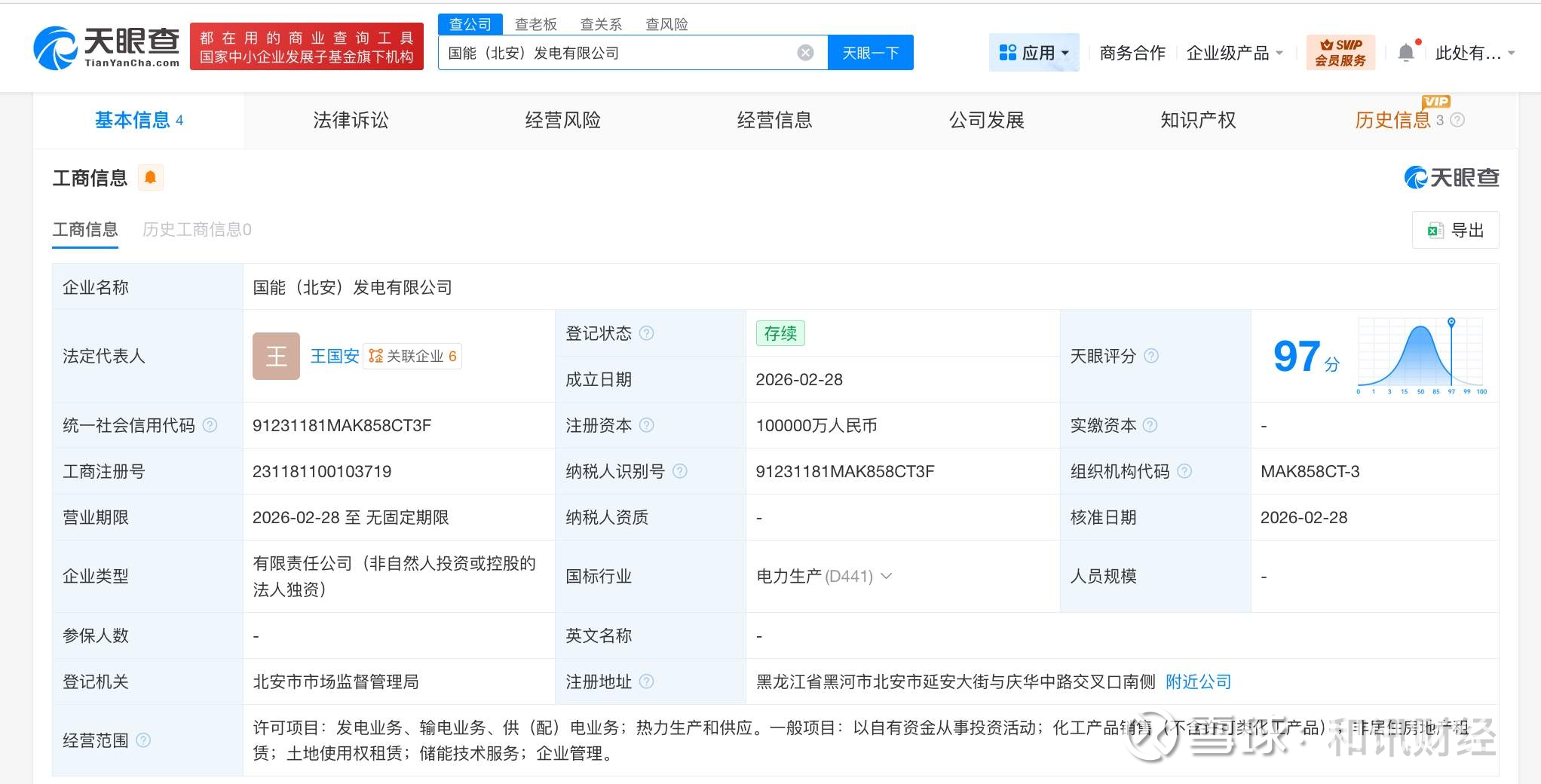 天眼查工商信息显示,近日,国能(北安)发电有限公司成立,法定代表人为王国安,注册资本10亿人民币,经营范围包括发电业务、输电业务、供(配)电业务,热力生产和供应,以自有资金从事投资活动,化工产品销售,非居住房地产租赁,储能技术服务等。股东信息显示,该公司由北京国电电力有限公司共同持股。