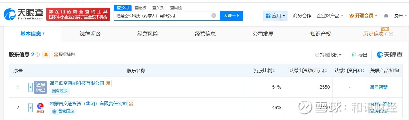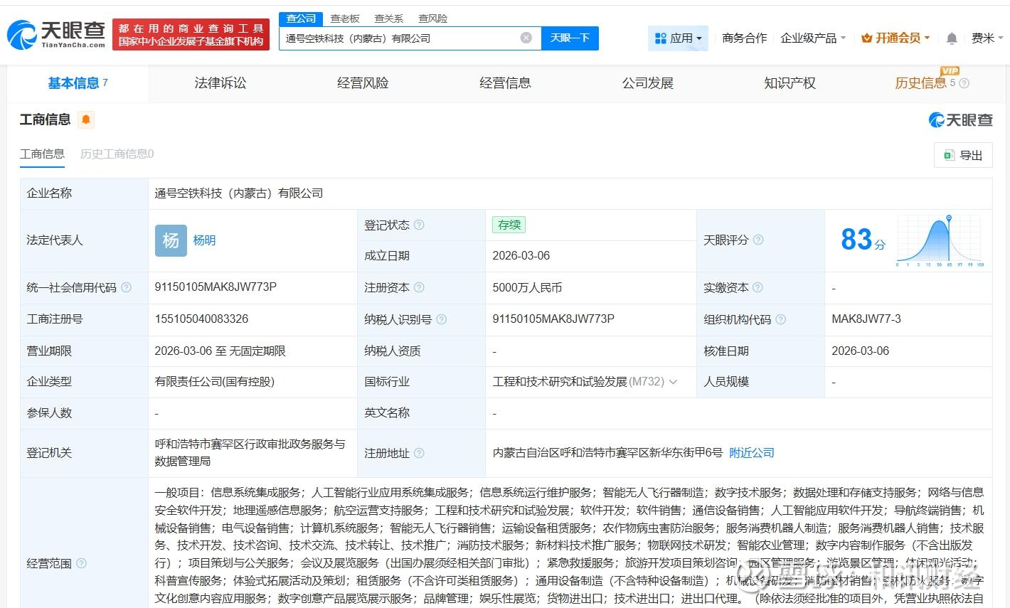 天眼查App显示,近日,通号空铁科技(内蒙古)有限公司成立,法定代表人为杨明,注册资本5000万人民币,经营范围包括信息系统集成服务、智能无人飞行器制造、航空运营支持服务、人工智能应用软件开发等。股东信息显示,该公司由中国通号(688009)旗下通号低空智能科技有限公司、内蒙古交通投资(集团)有限责任公司共同持股。