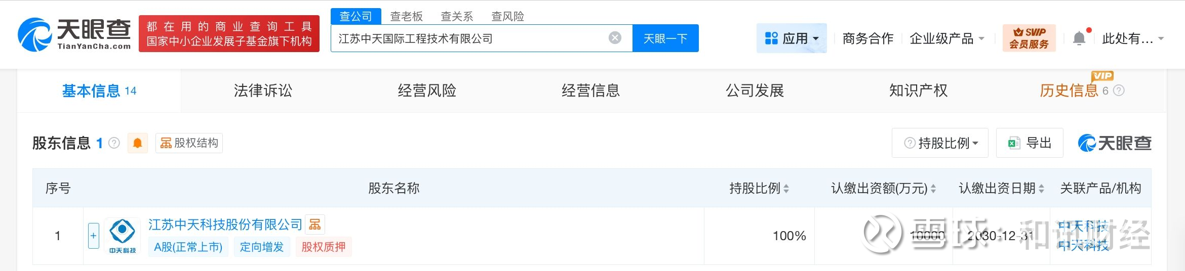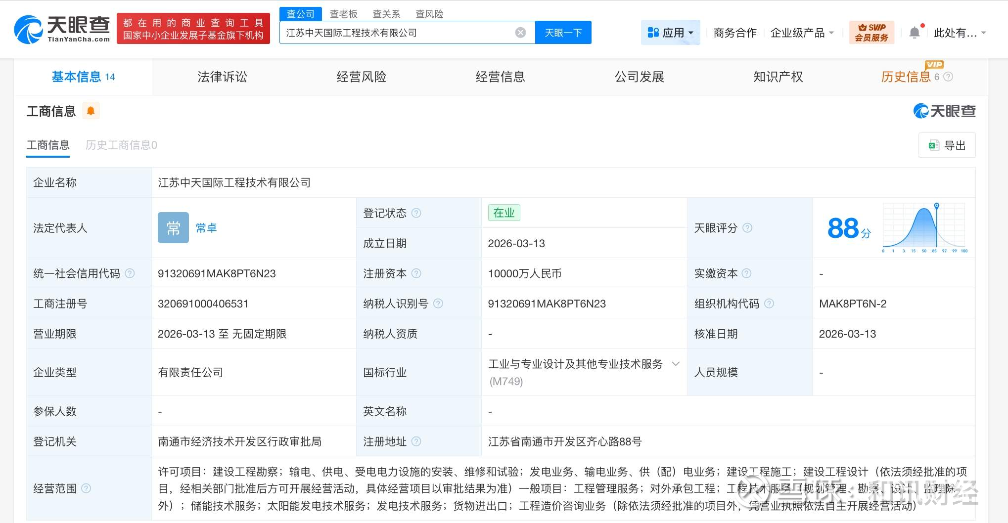 天眼查工商信息显示,3月13日,江苏中天国际工程技术有限公司成立,法定代表人为常卓,注册资本1亿人民币,经营范围包括建设工程勘察、建设工程施工、建设工程设计、对外承包工程、储能技术服务、太阳能发电技术服务、发电技术服务等。股东信息显示,该公司由中天科技(600522)全资持股。