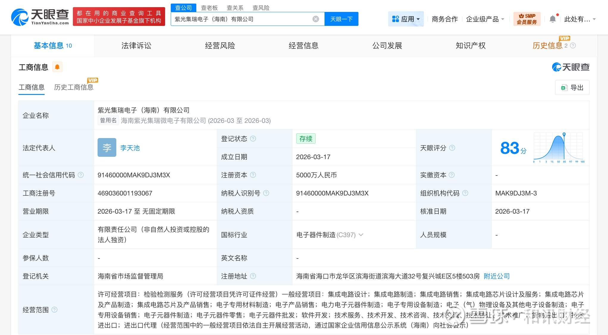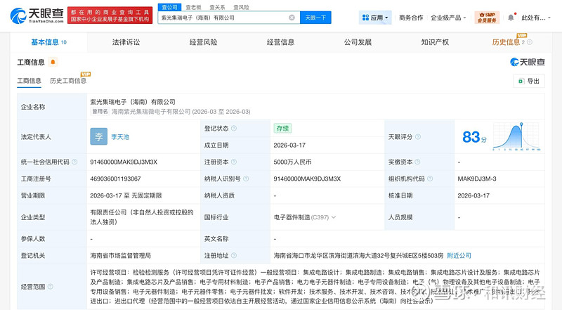 天眼查工商信息显示,近日,紫光集瑞电子(海南)有限公司成立,法定代表人为李天池,注册资本5000万人民币,经营范围包括集成电路设计、集成电路制造、集成电路销售、集成电路芯片设计及服务、电子专用材料制造、软件开发等。股权全景穿透图显示,该公司由深圳市国微电子有限公司全资持股,后者为紫光国微(002049)全资子公司。