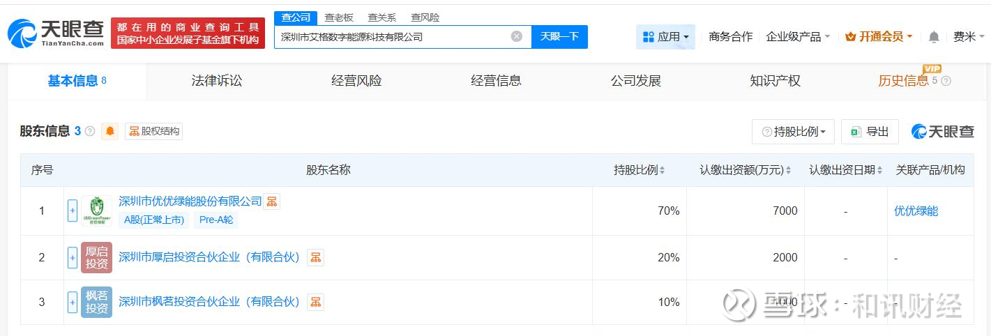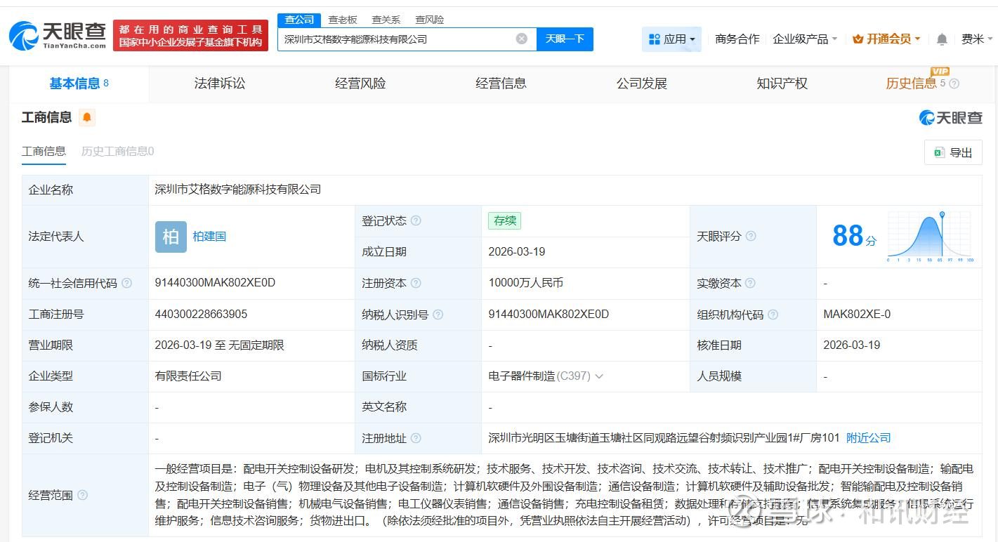 天眼查App显示,3月19日,深圳市艾格数字能源科技有限公司成立,法定代表人为柏建国,注册资本1亿人民币,经营范围包括配电开关控制设备研发、输配电及控制设备制造、计算机软硬件及外围设备制造等。股东信息显示,该公司由优优绿能(301590)、深圳市厚启投资合伙企业(有限合伙)、深圳市枫茗投资合伙企业(有限合伙)共同持股。