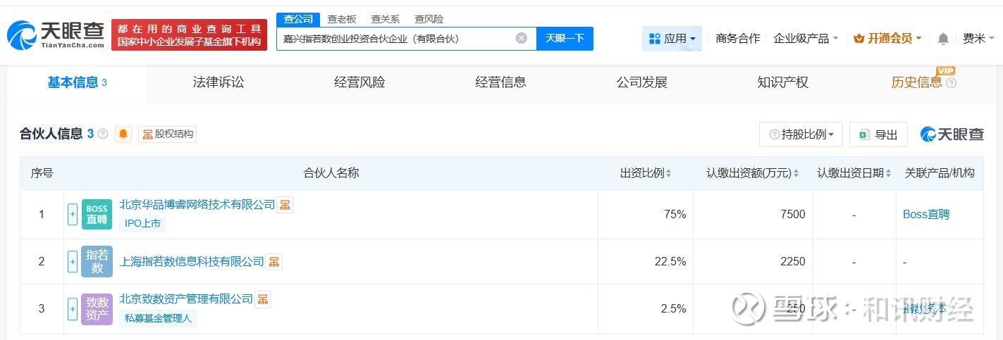 天眼查App显示,近日,嘉兴指若数创业投资合伙企业(有限合伙)成立,执行事务合伙人为北京致数资产管理有限公司,出资额1亿人民币,经营范围为创业投资。合伙人信息显示,该合伙企业由Boss直聘关联公司北京华品博睿网络技术有限公司、上海指若数信息科技有限公司、北京致数资产管理有限公司共同出资。