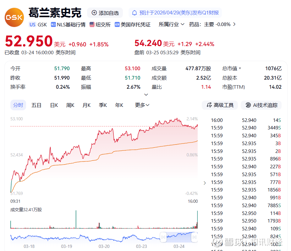 GSK是英国老牌药企,全球制药巨头之一,业务覆盖呼吸、疫苗、HIV等多个领域。截至2026年3月,市值约1076亿美元。