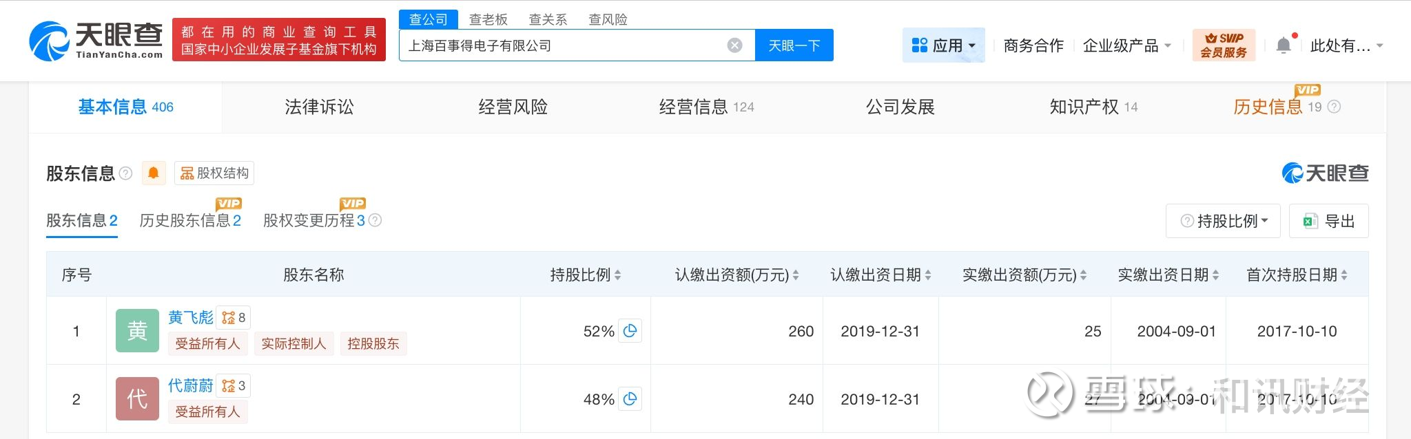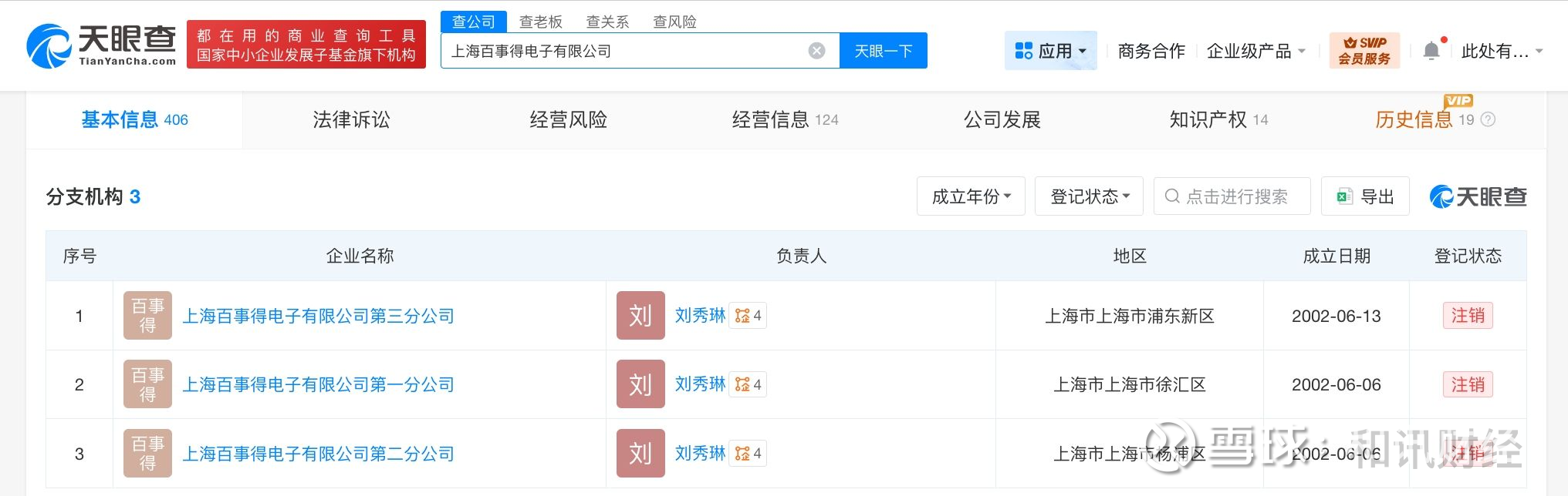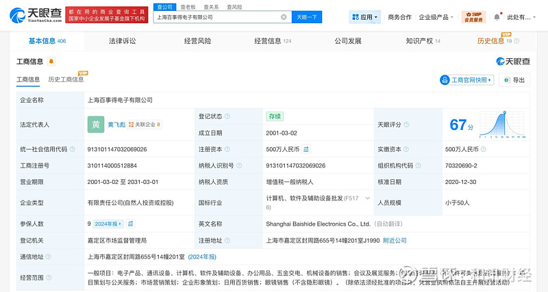 天眼查App显示,上海百事得电子有限公司成立于2001年3月,法定代表人为黄飞彪,注册资本500万人民币,经营范围含电子产品、通讯设备、计算机、软件及辅助设备、办公用品、五金交电、机械设备的销售,信息咨询服务,项目策划与公关服务等。股东信息显示,该公司由黄飞彪、代蔚蔚共同持股。分支机构信息显示,该公司旗下的三家分公司均已注销。